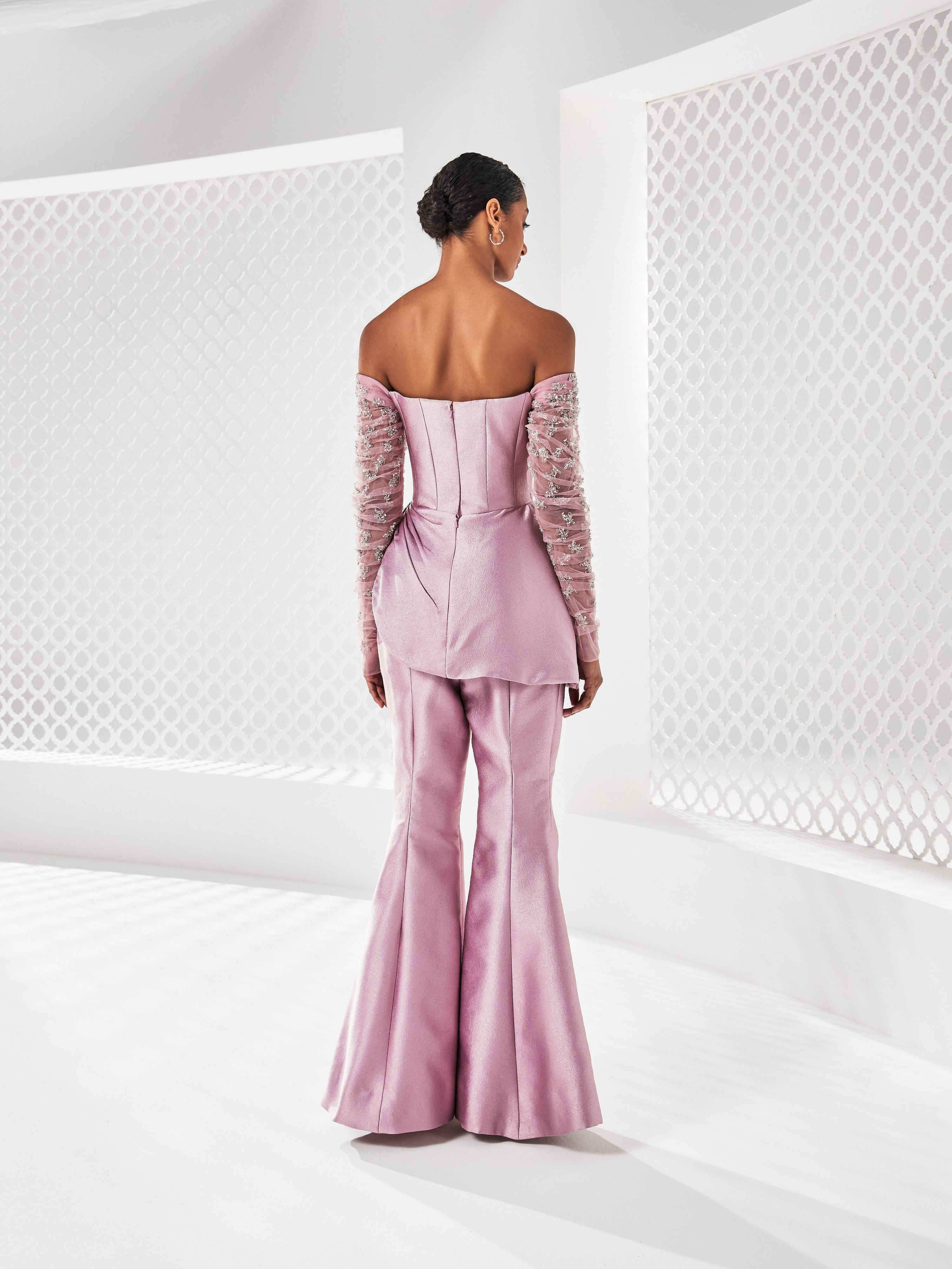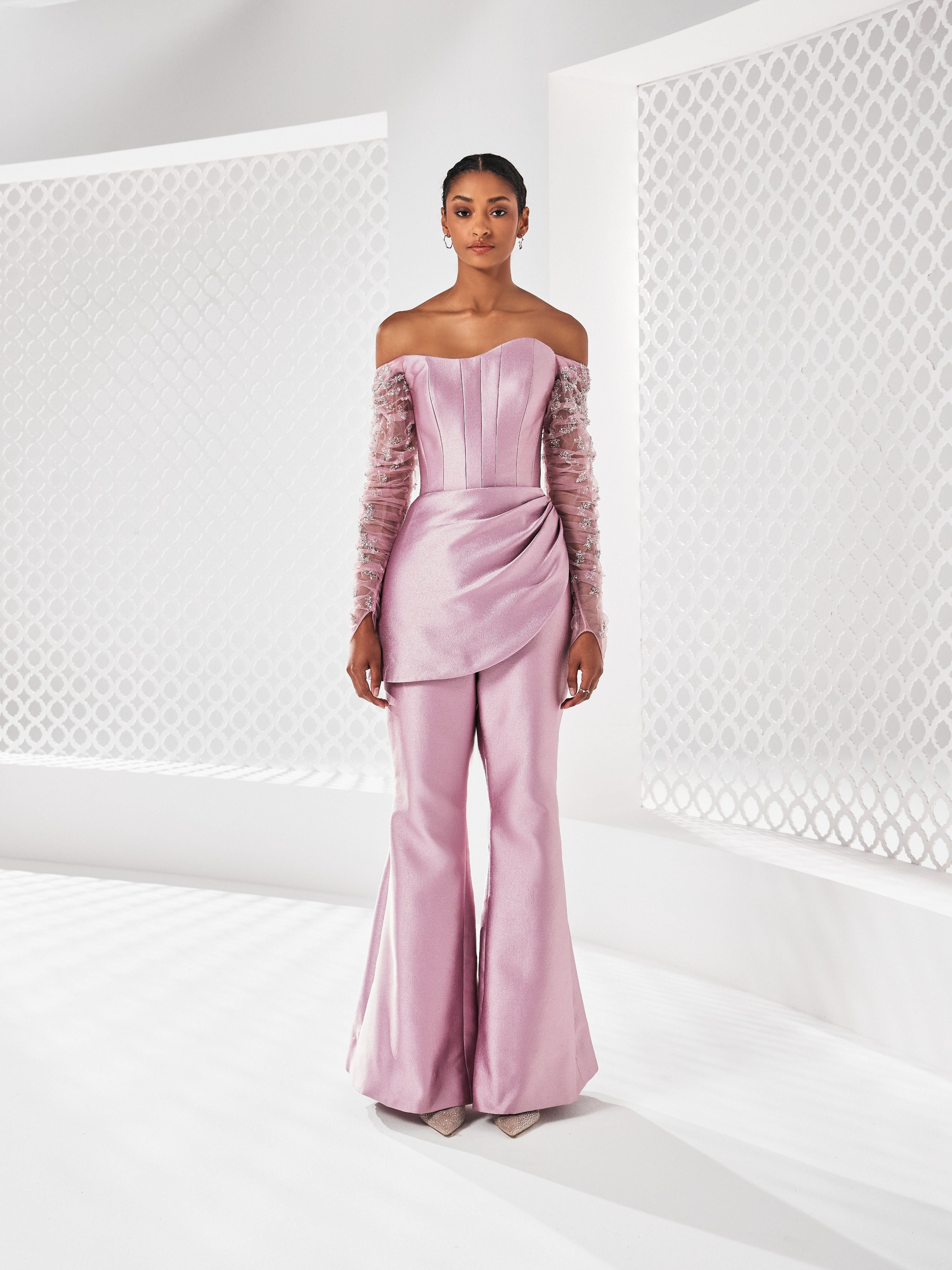 Crisp Asymmetrical Corset Jumpsuit With Gathered Embellished Tulle Sleeves And Side Draping
