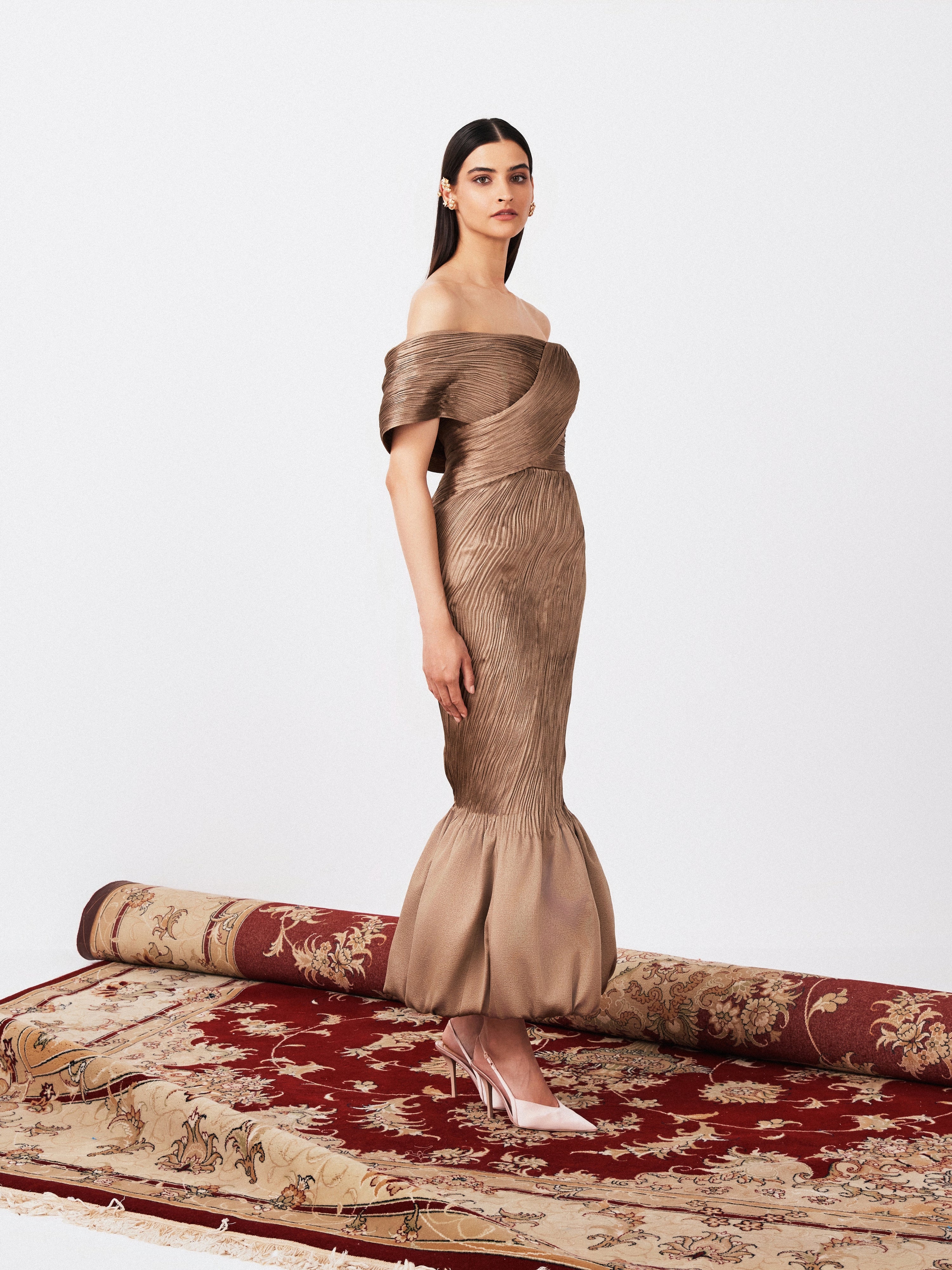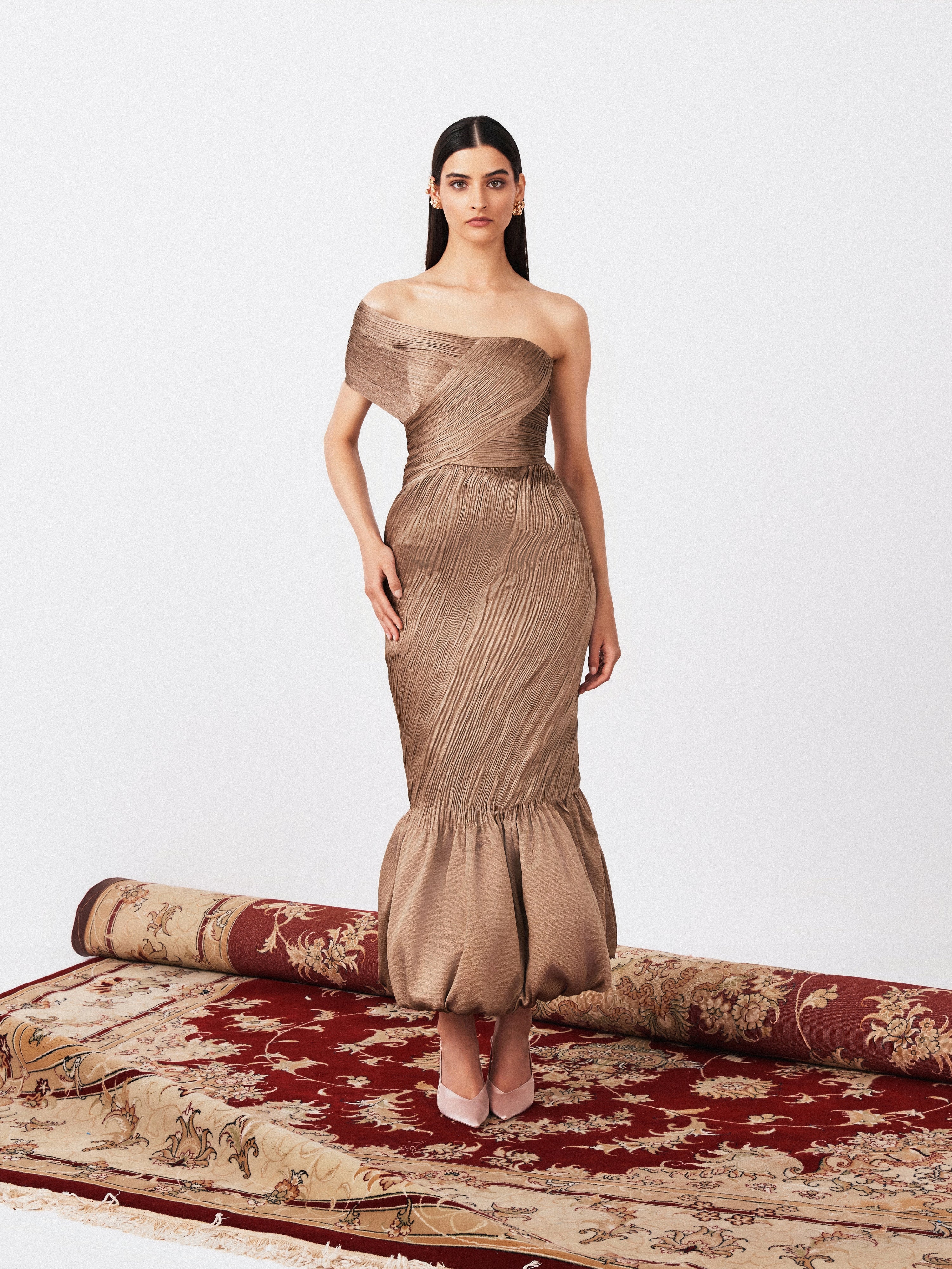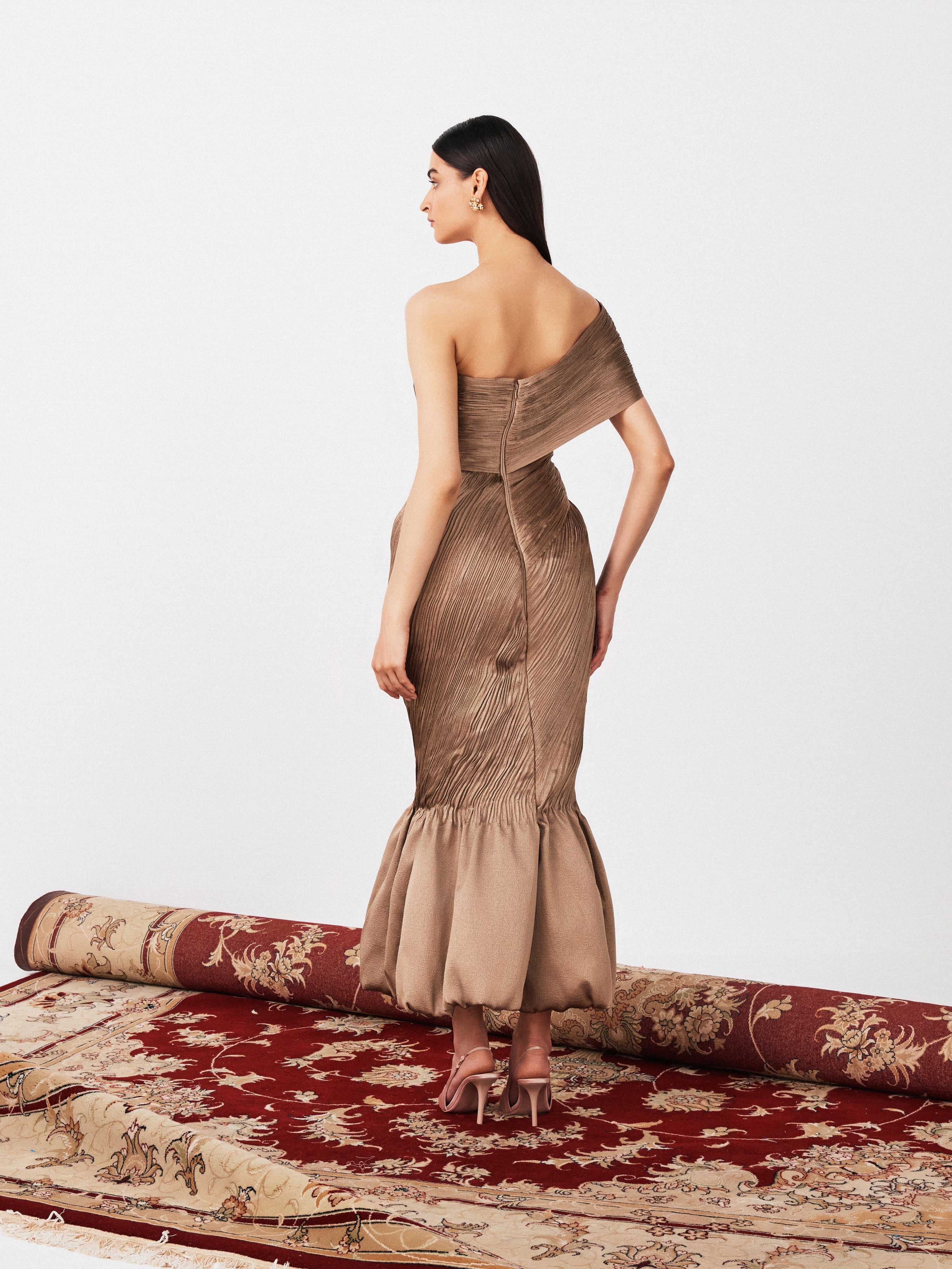 Full Bodice Fit Fabric Manipulation Gown With Balloon Cut Detail At The Bottom