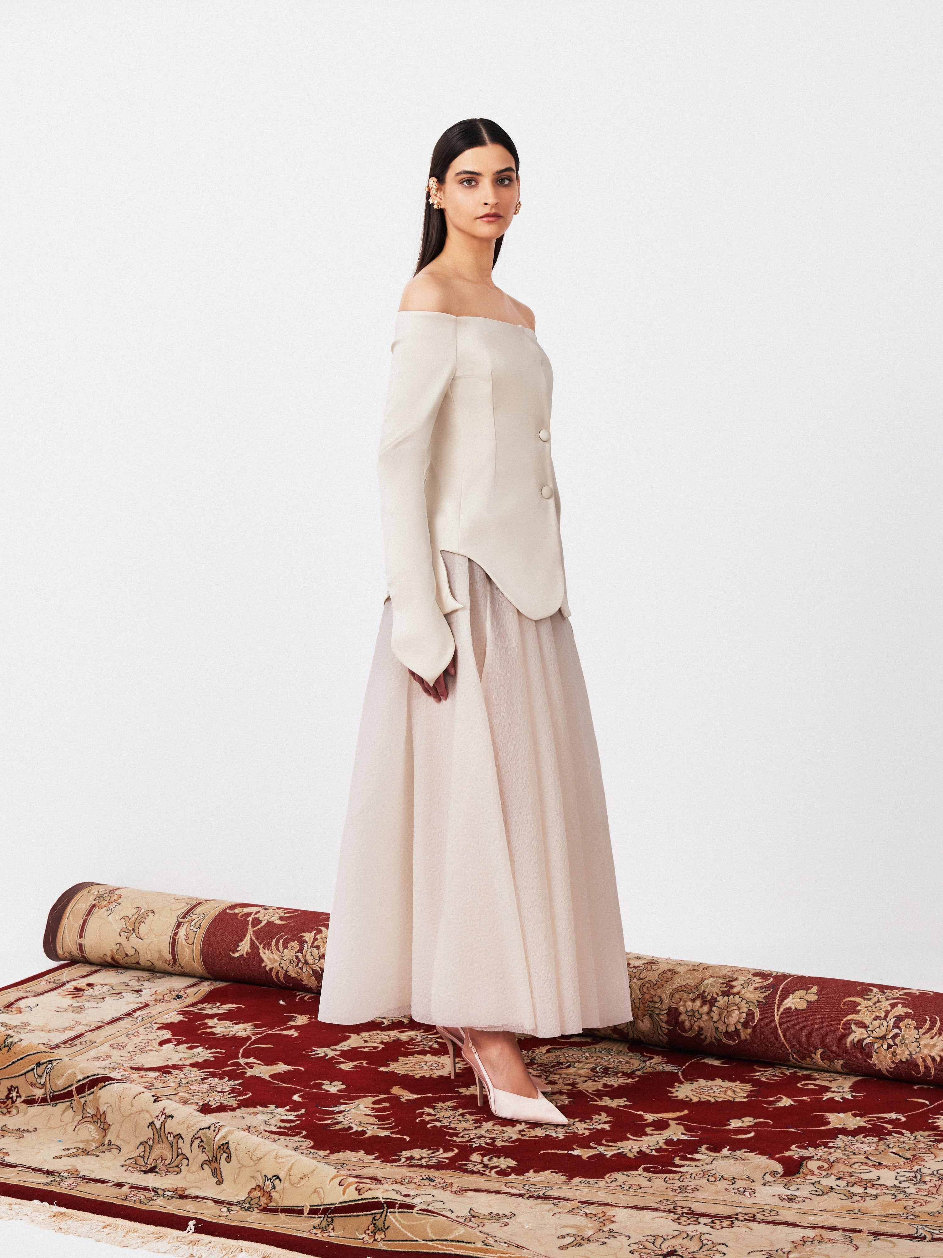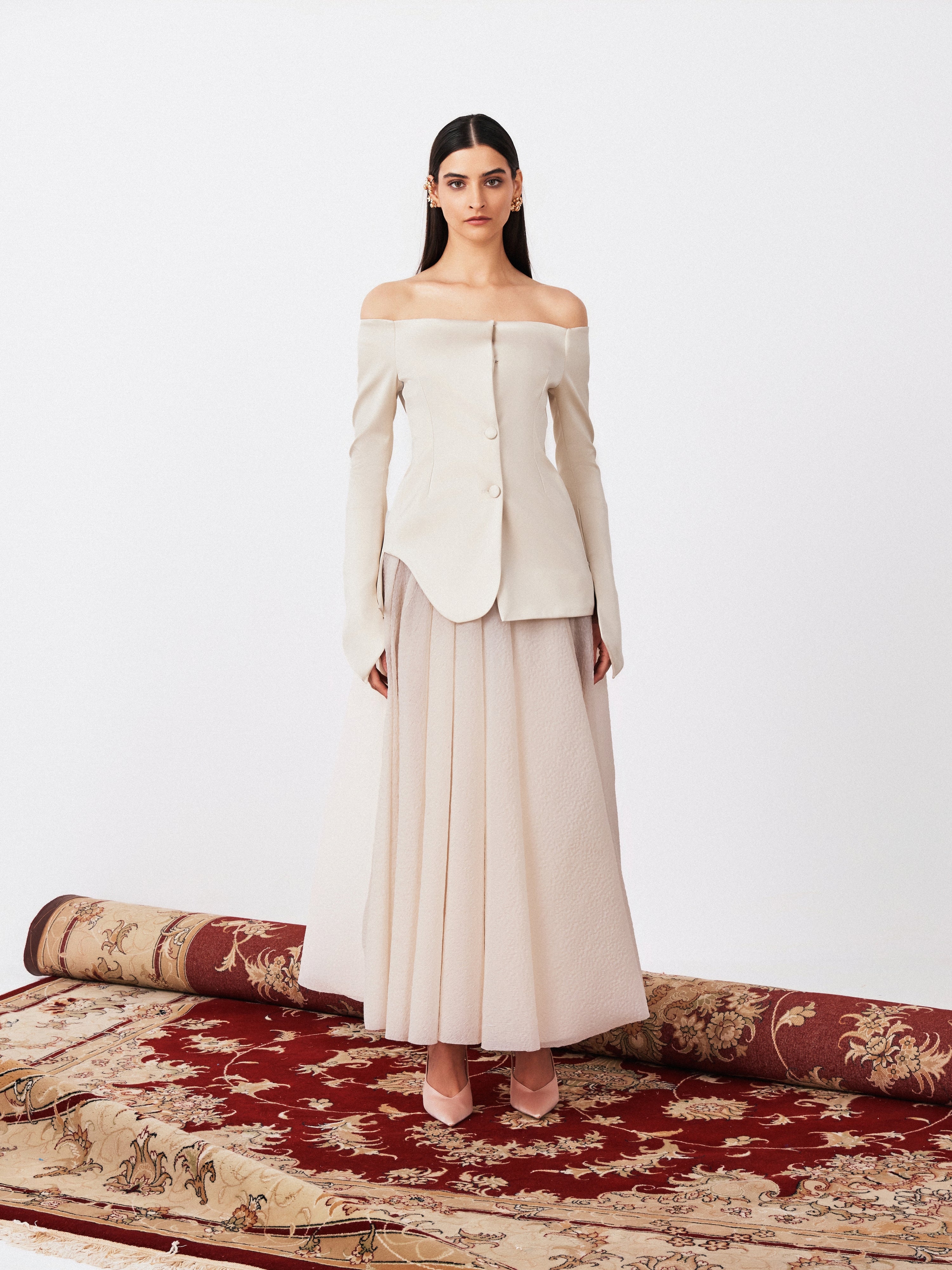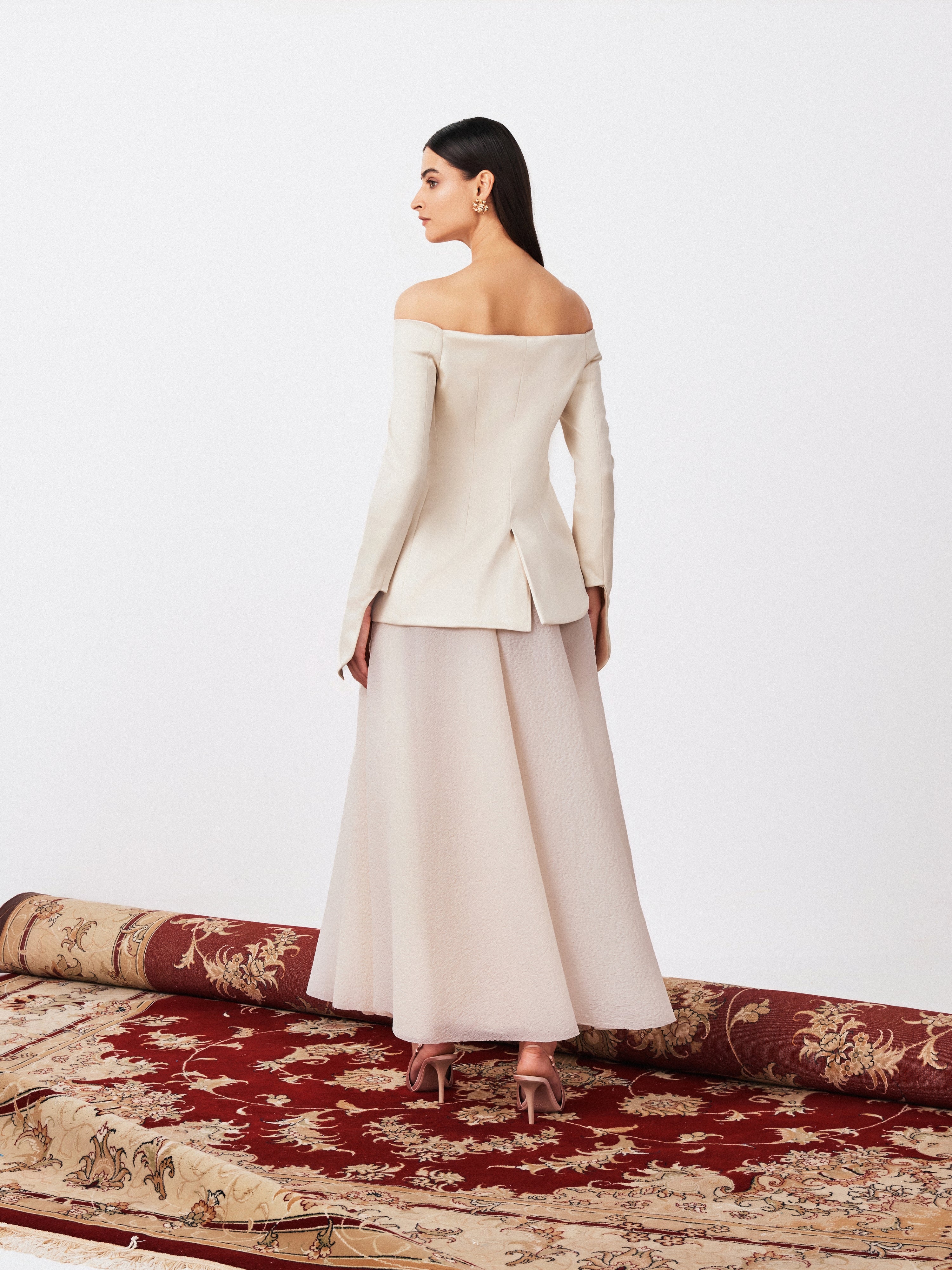 Off-Shoulder Inner Corset Jacket With Leaf Cut And Details Textured Ankle Cloche/ Flared Skirt