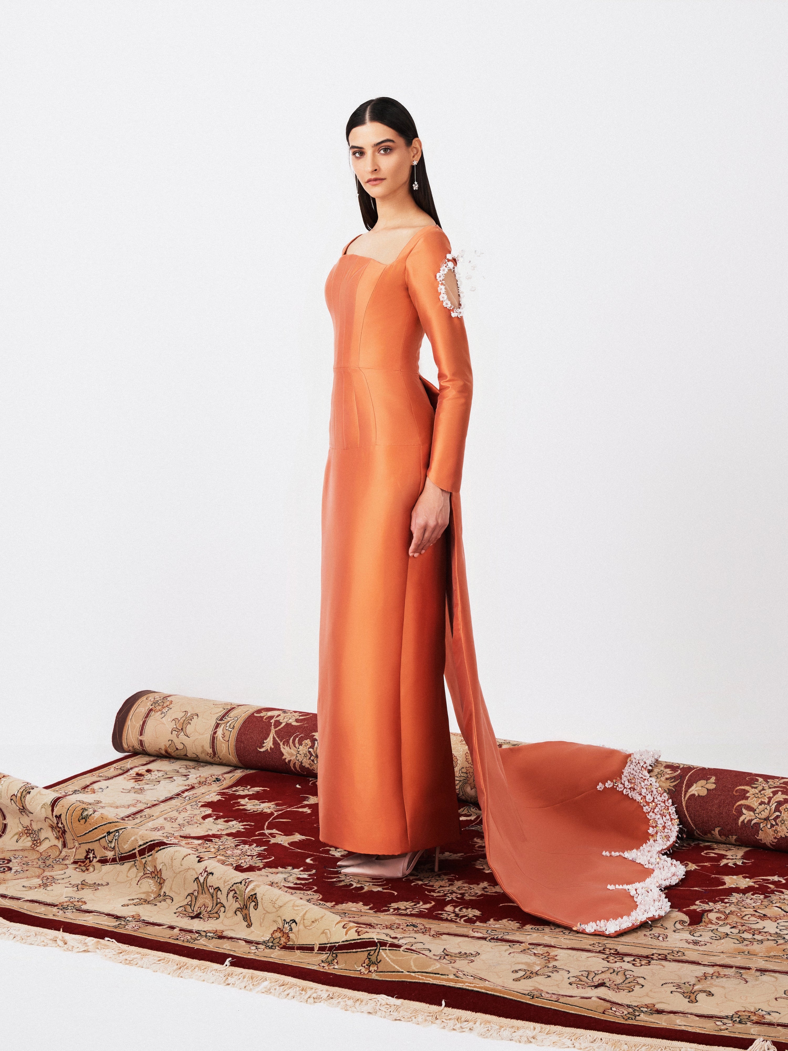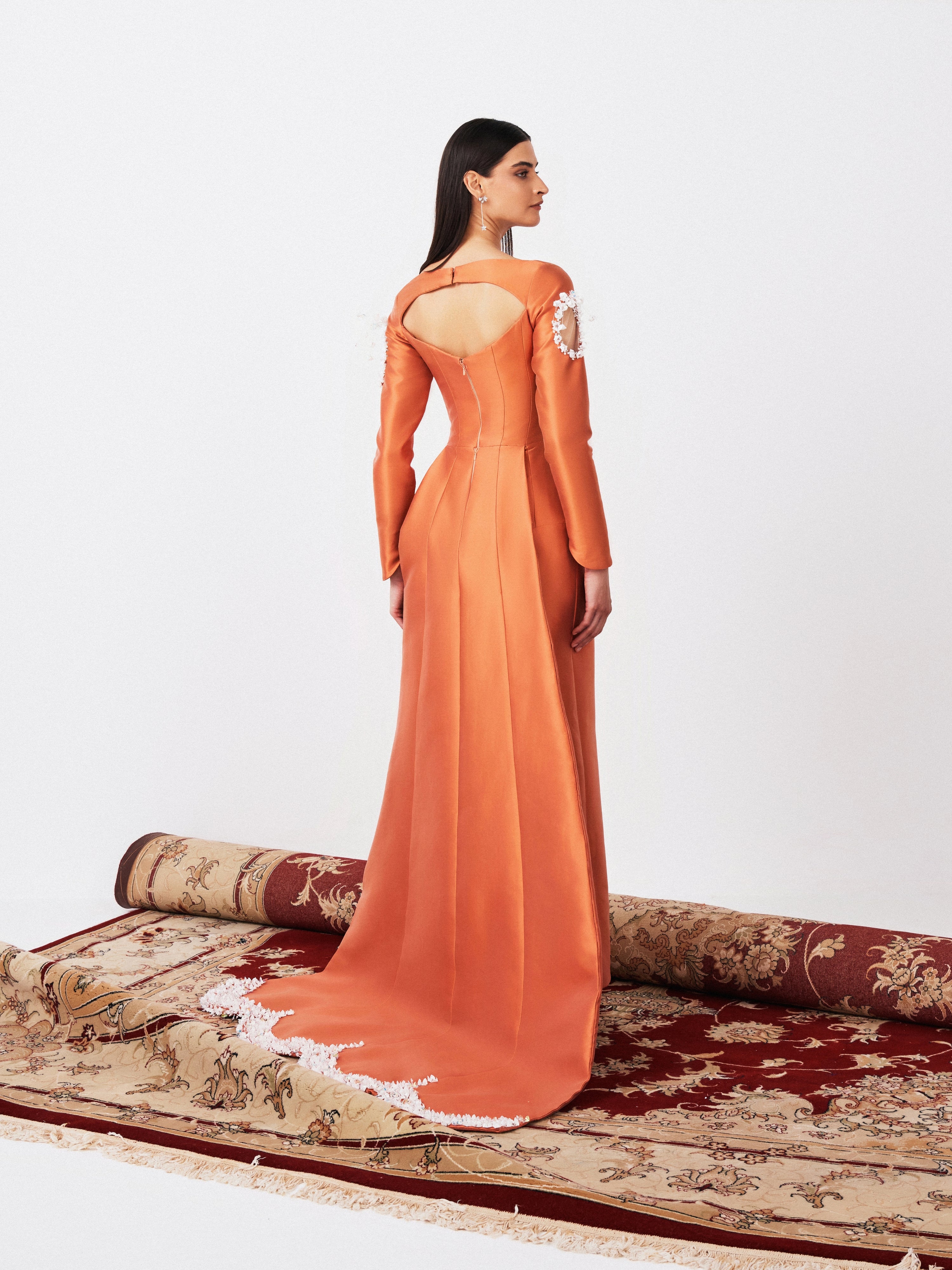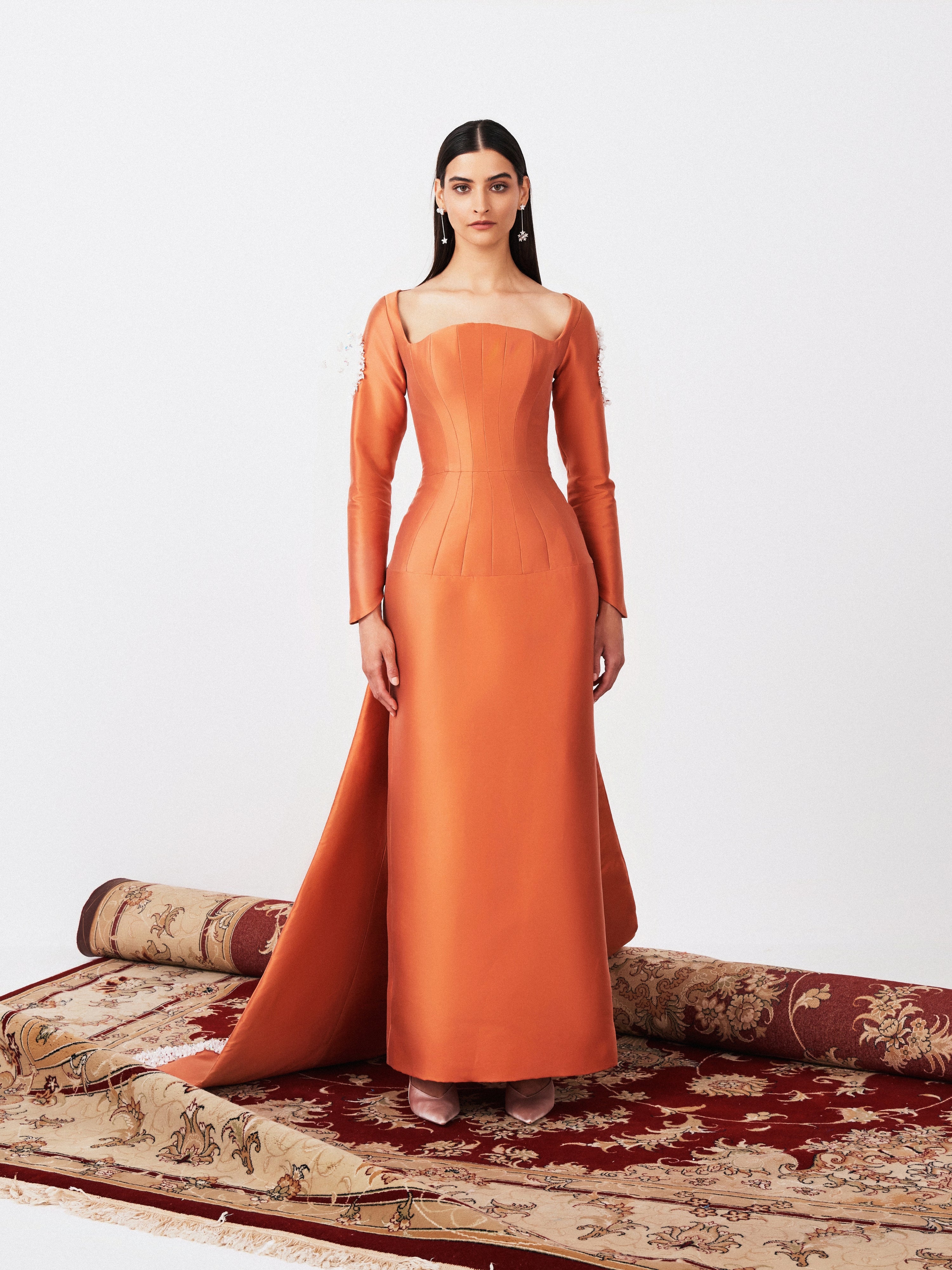 Straight Full Sleeve Asymmetrical Corset Gown With Signature Curved Train Embroidered Detail.