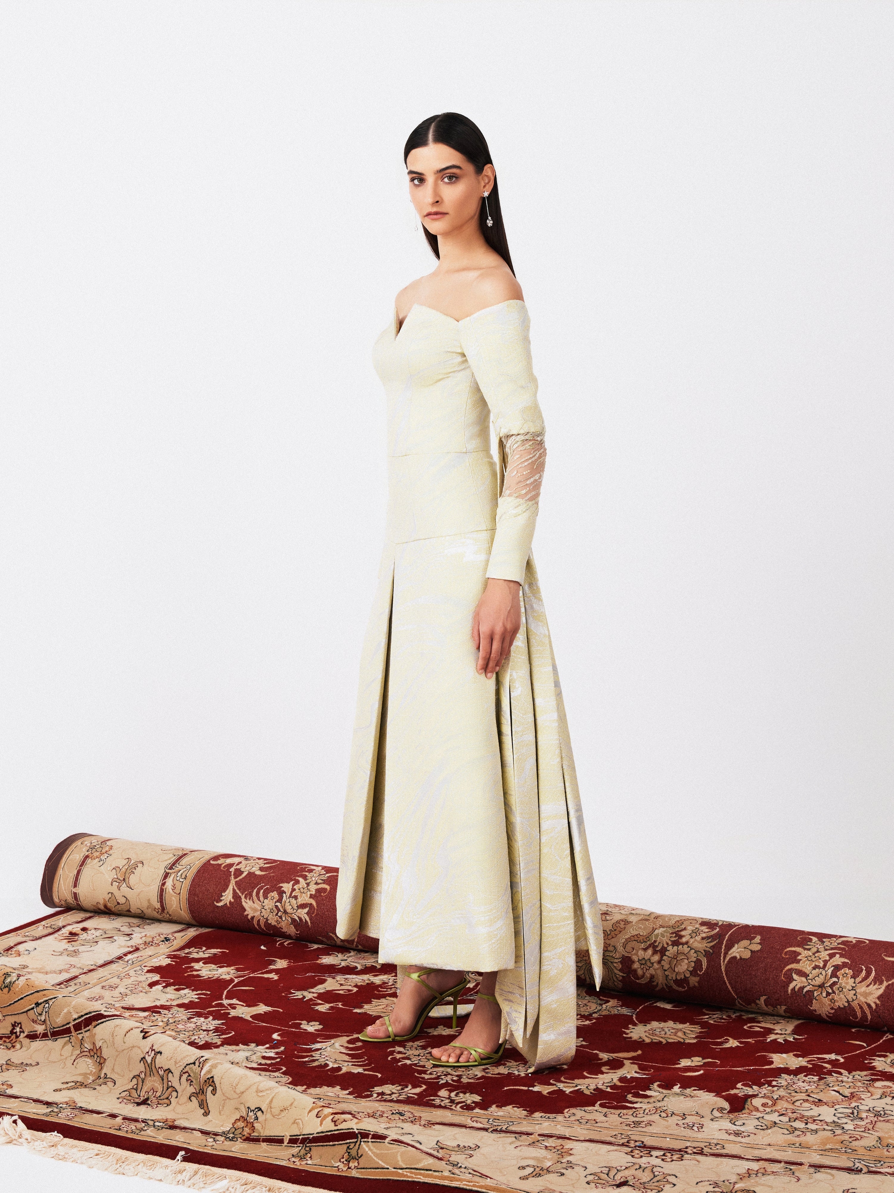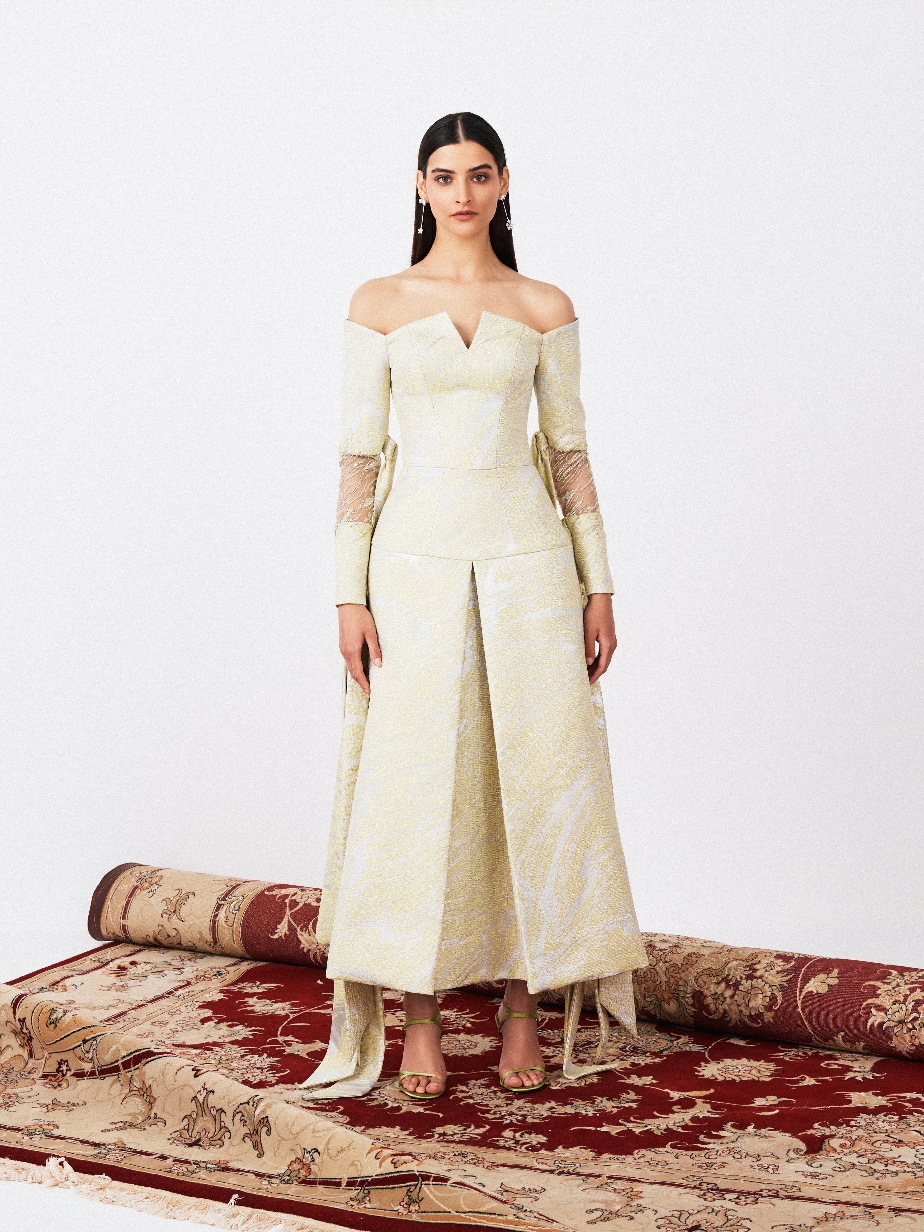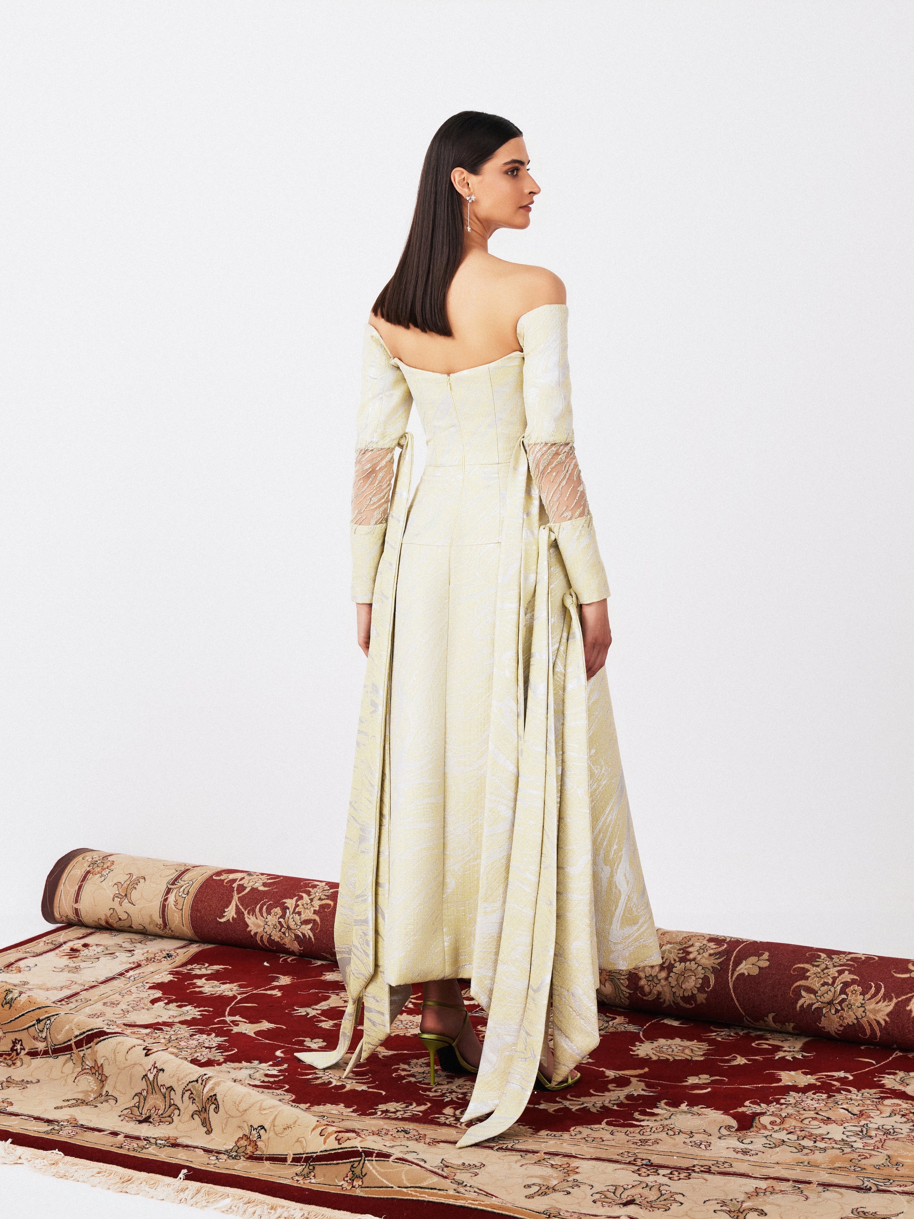 Textured Off Shoulder Gown With Front Box Pleat Detail And Dramatic Ribbons From The Sleeves