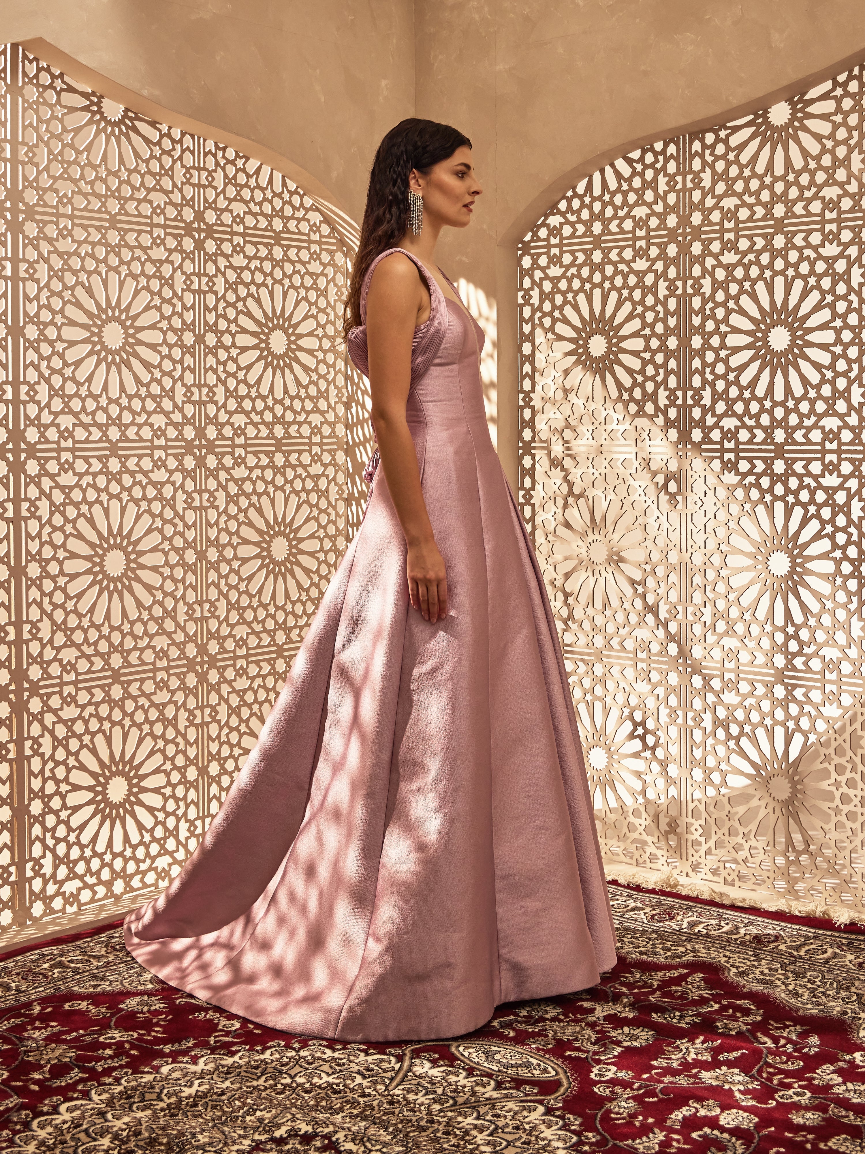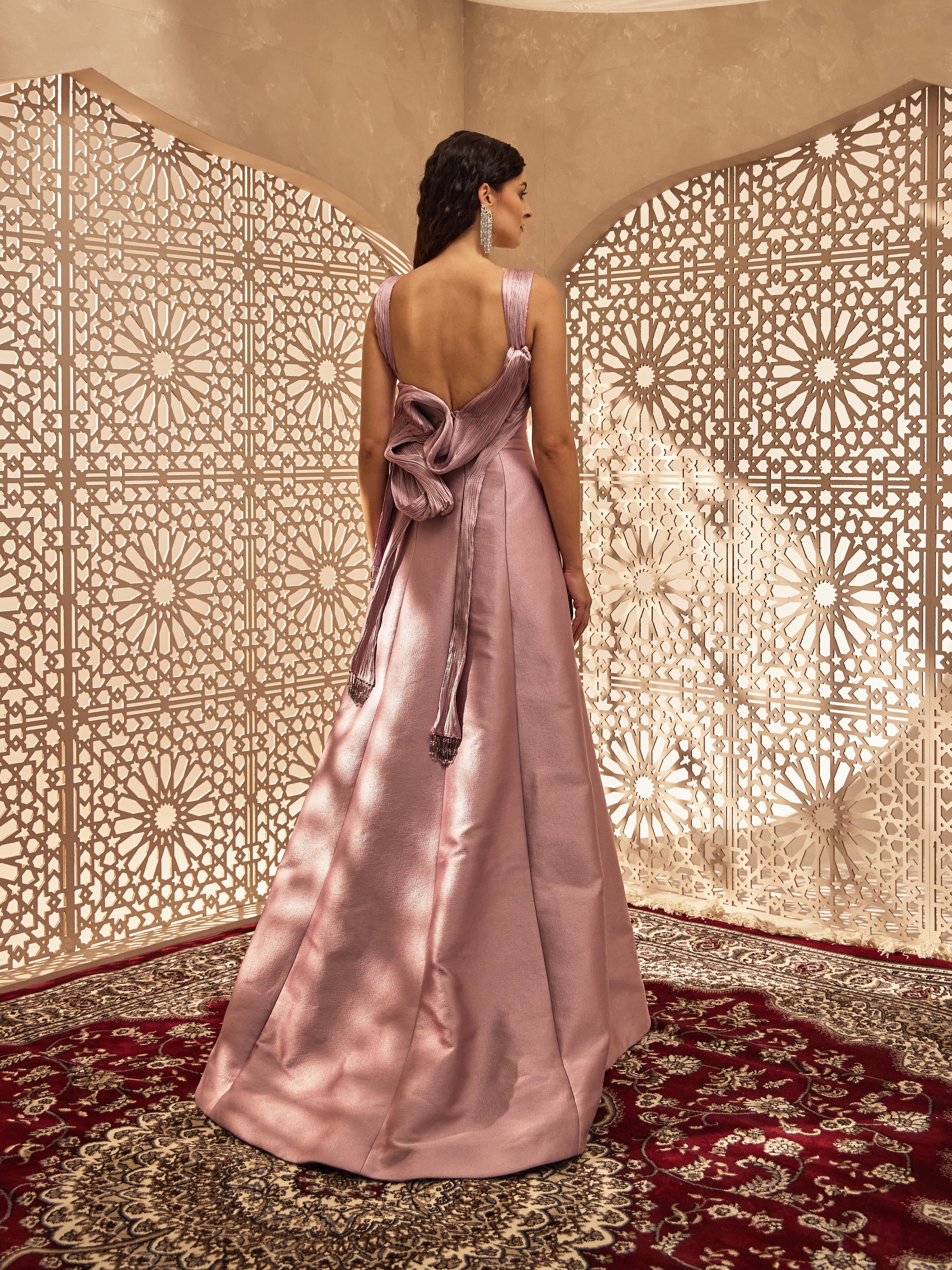 A-LINE VOLUMINOUS GOWN WITH SIGNATURE PLEATING DETAIL AND TASSLE RIBBONS