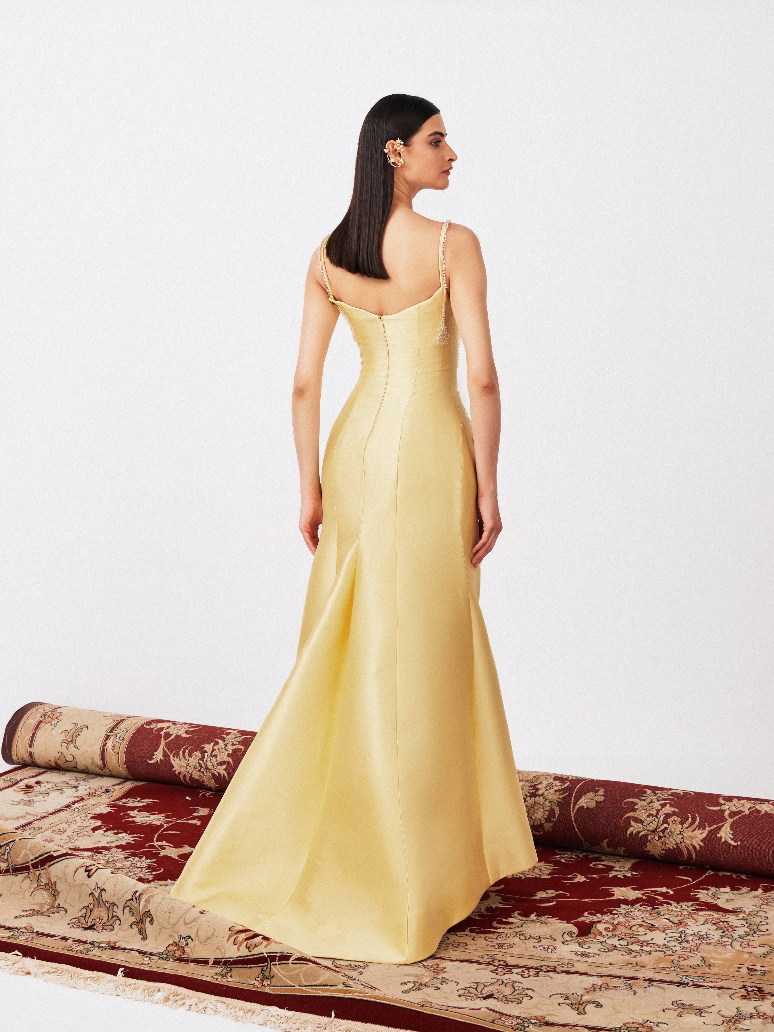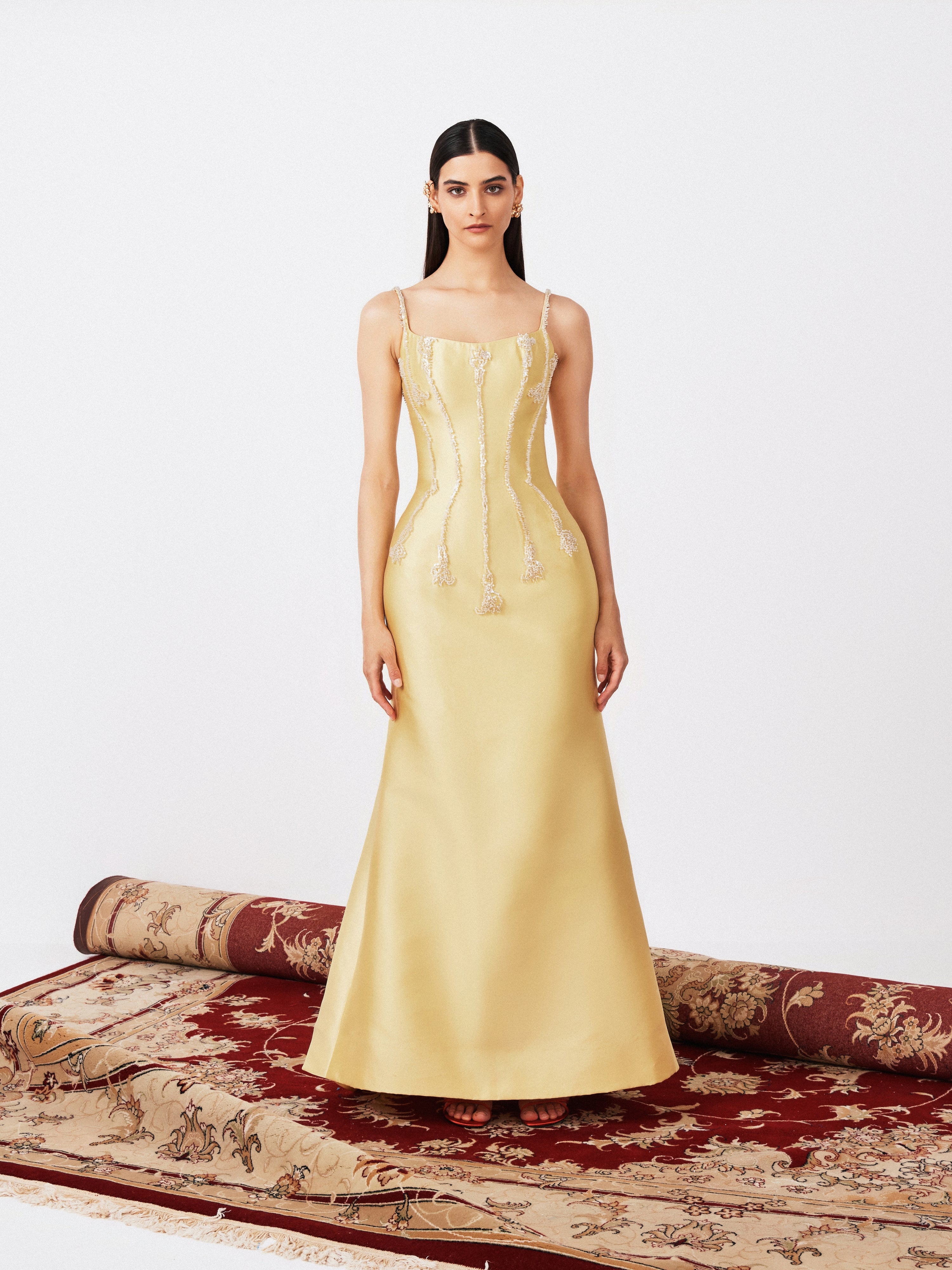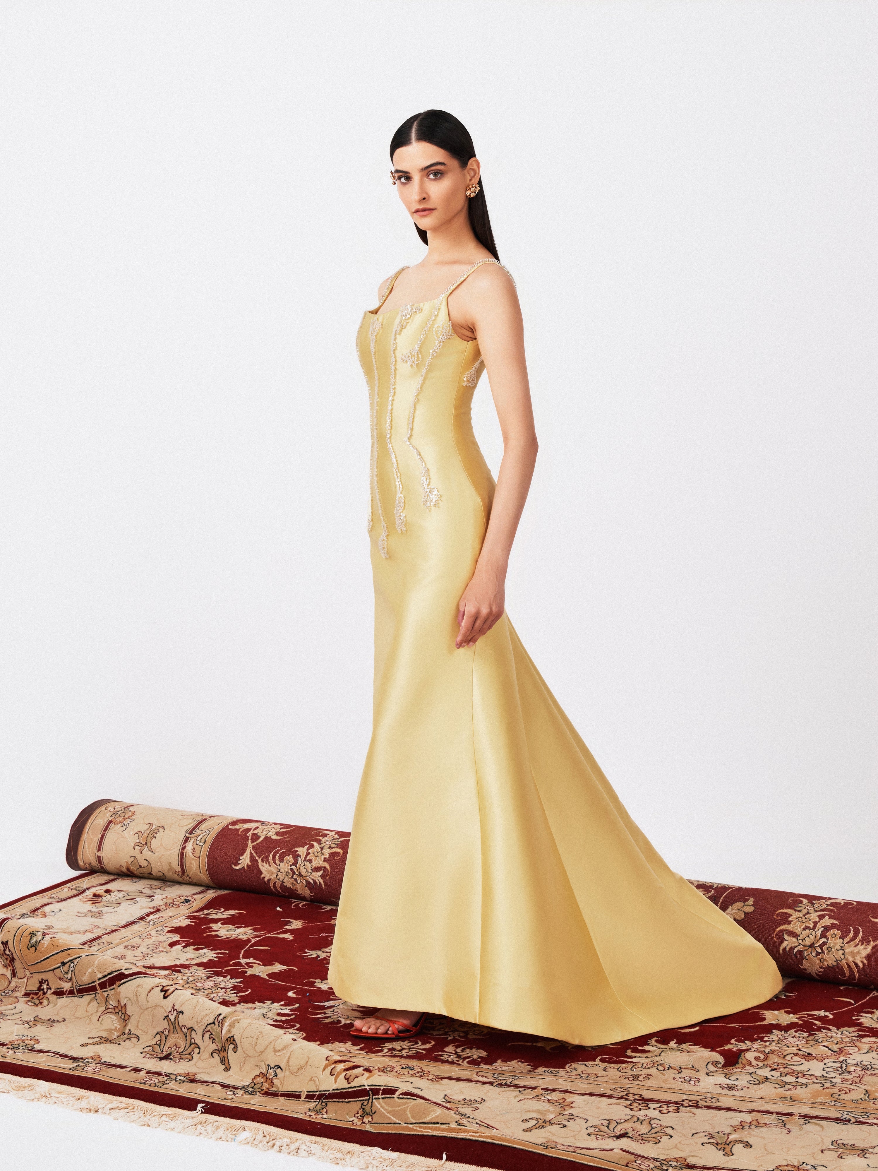 sleeveless Mikado Bodice Fit Gown With 3D Standing Desert Rose Embellishments