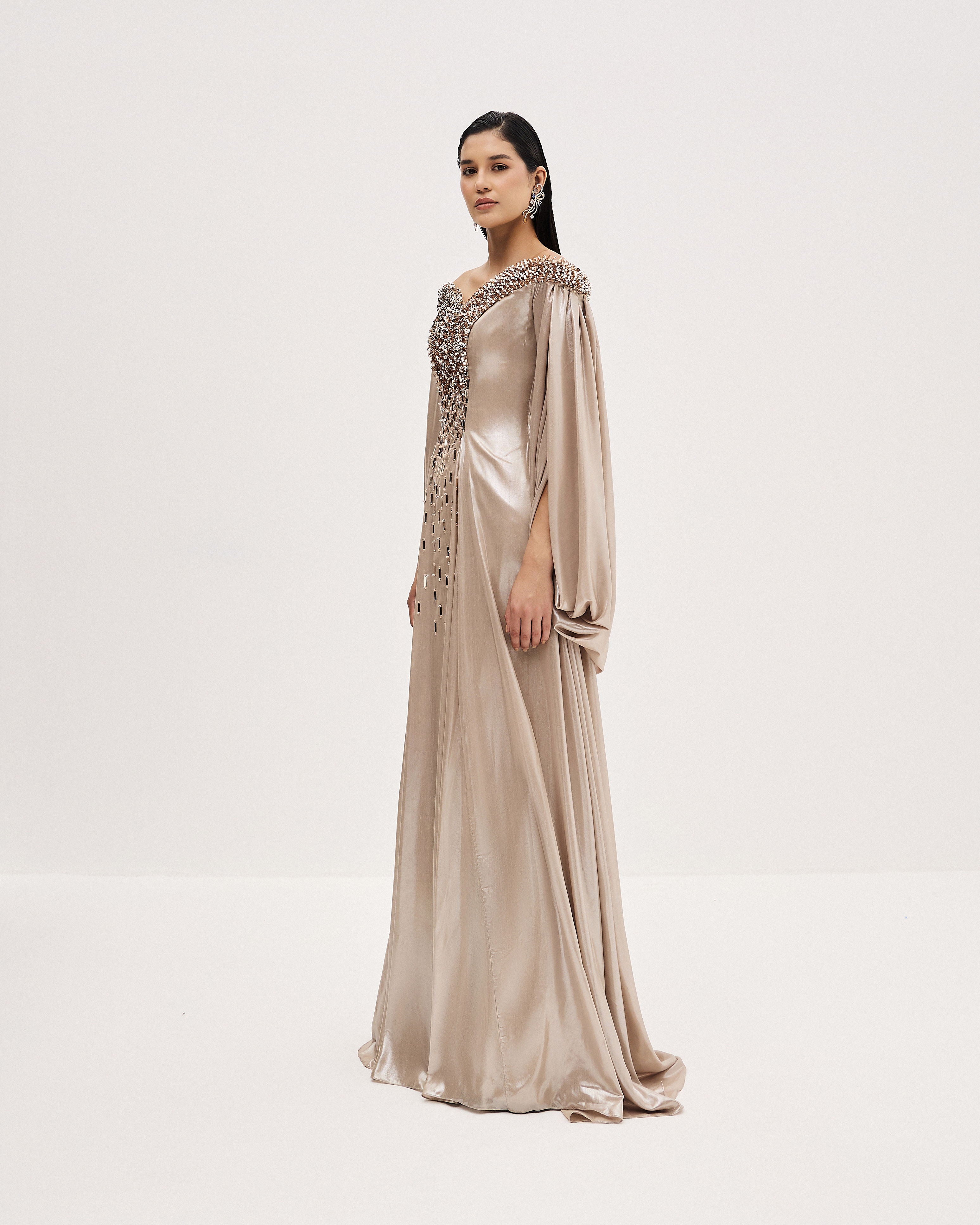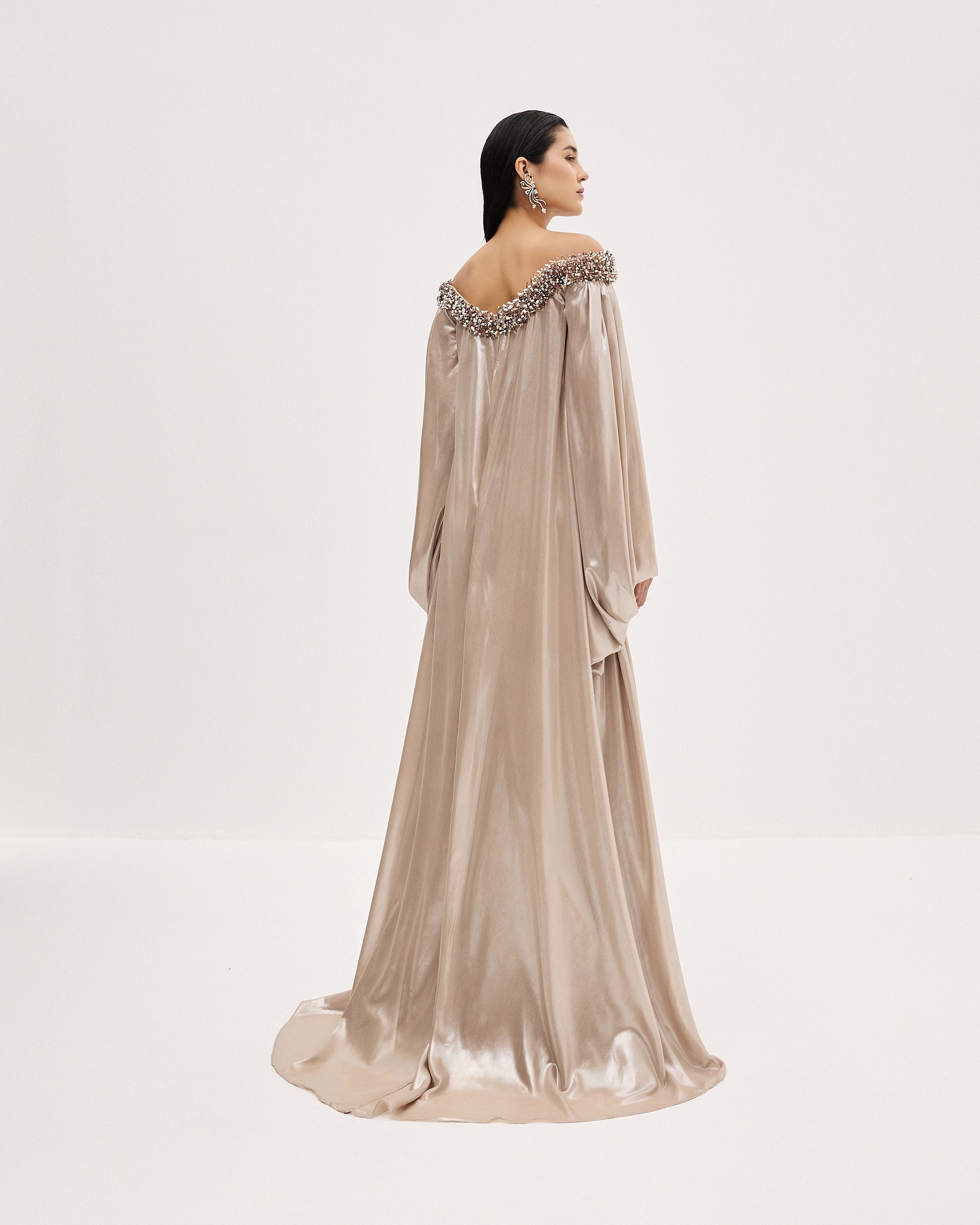 An off-shoulder gown crafted from flowing chiffon, featuring delicate 3D scattered embroidery across the neckline and bodice, with soft draped sleeves for added elegance.