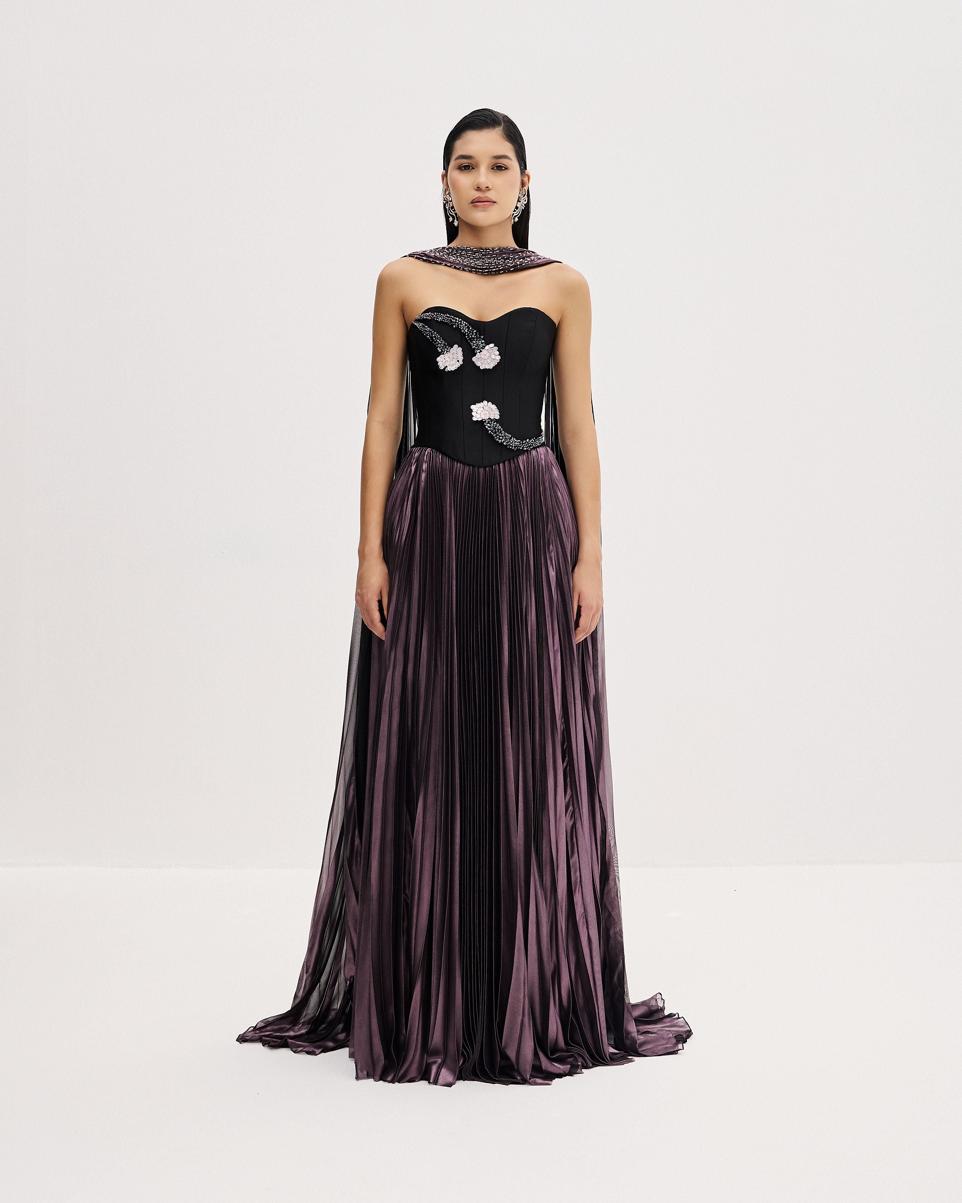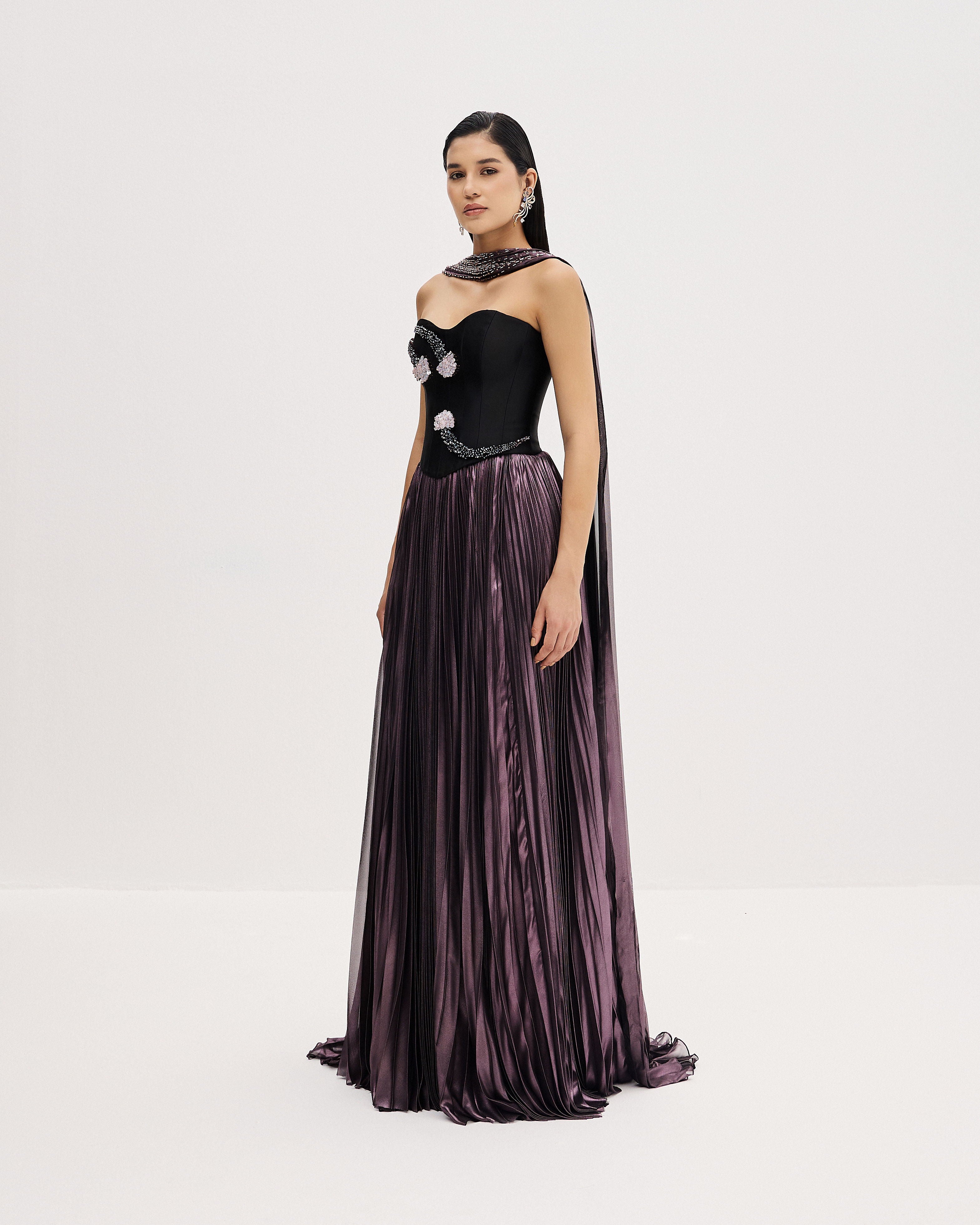 A strapless black mikado corset with 3D embellishments, paired with a flowing pleated metallic chiffon skirt. The look is completed with a matching draped collar adorned with scattered embellishments, adding a touch of drama.