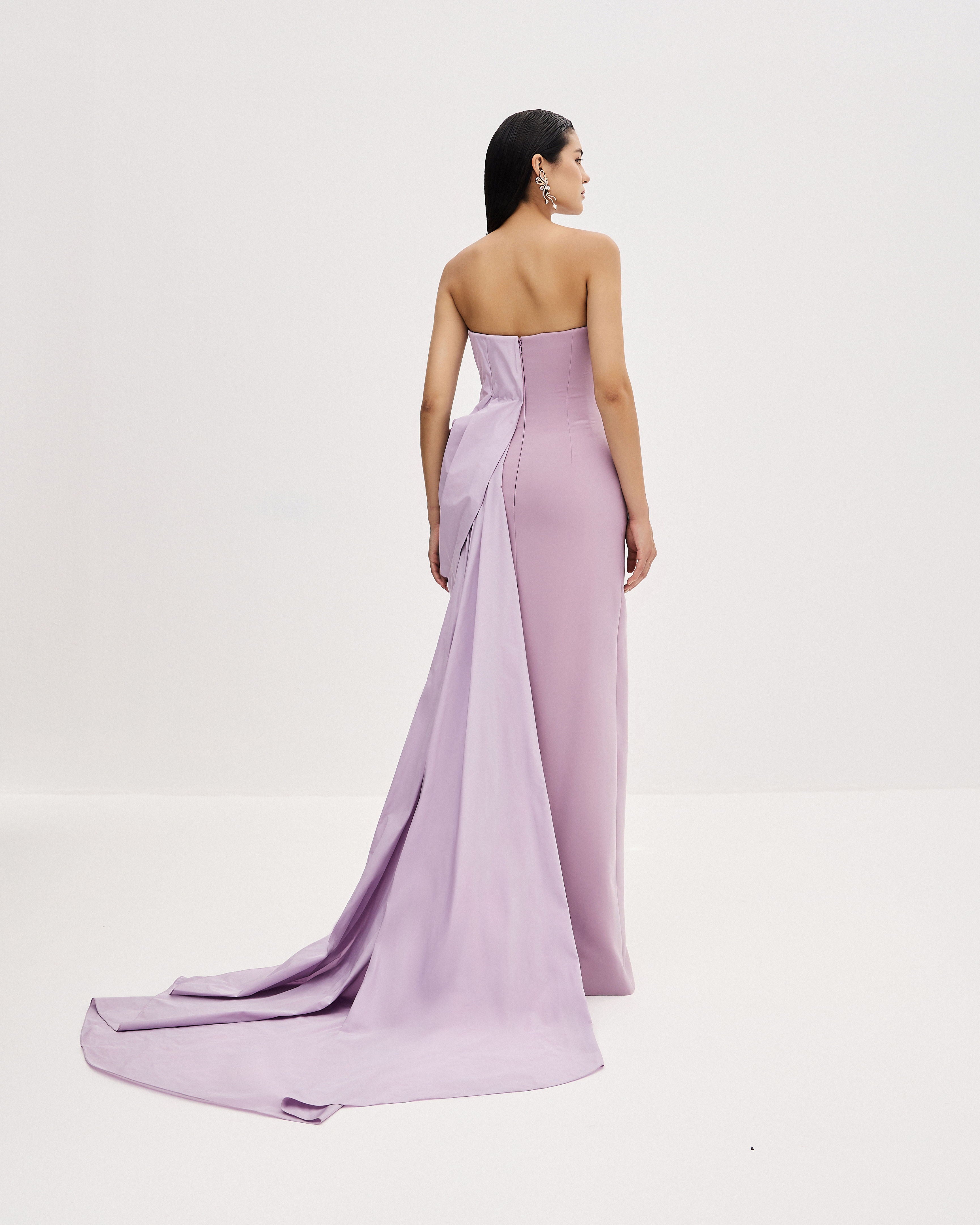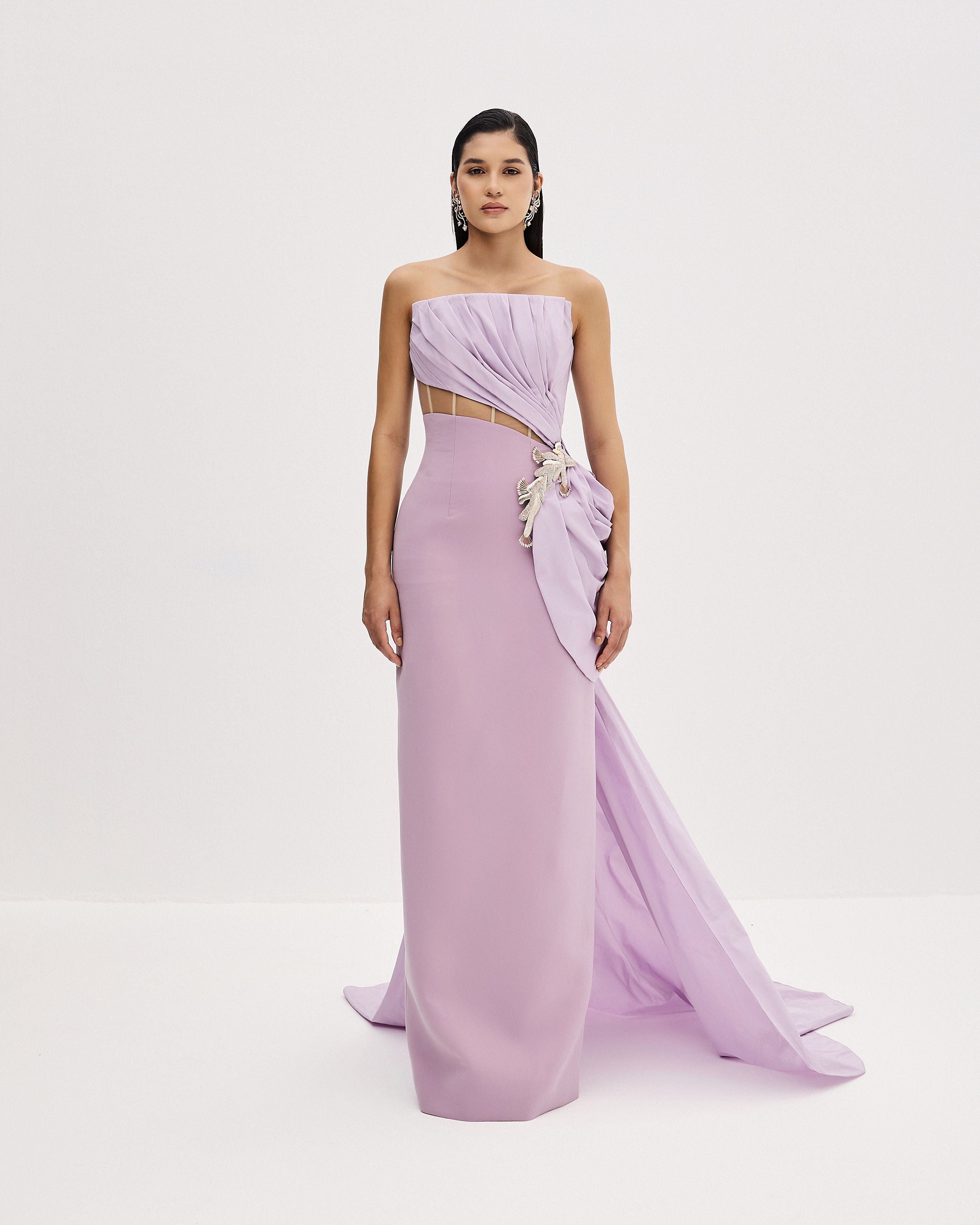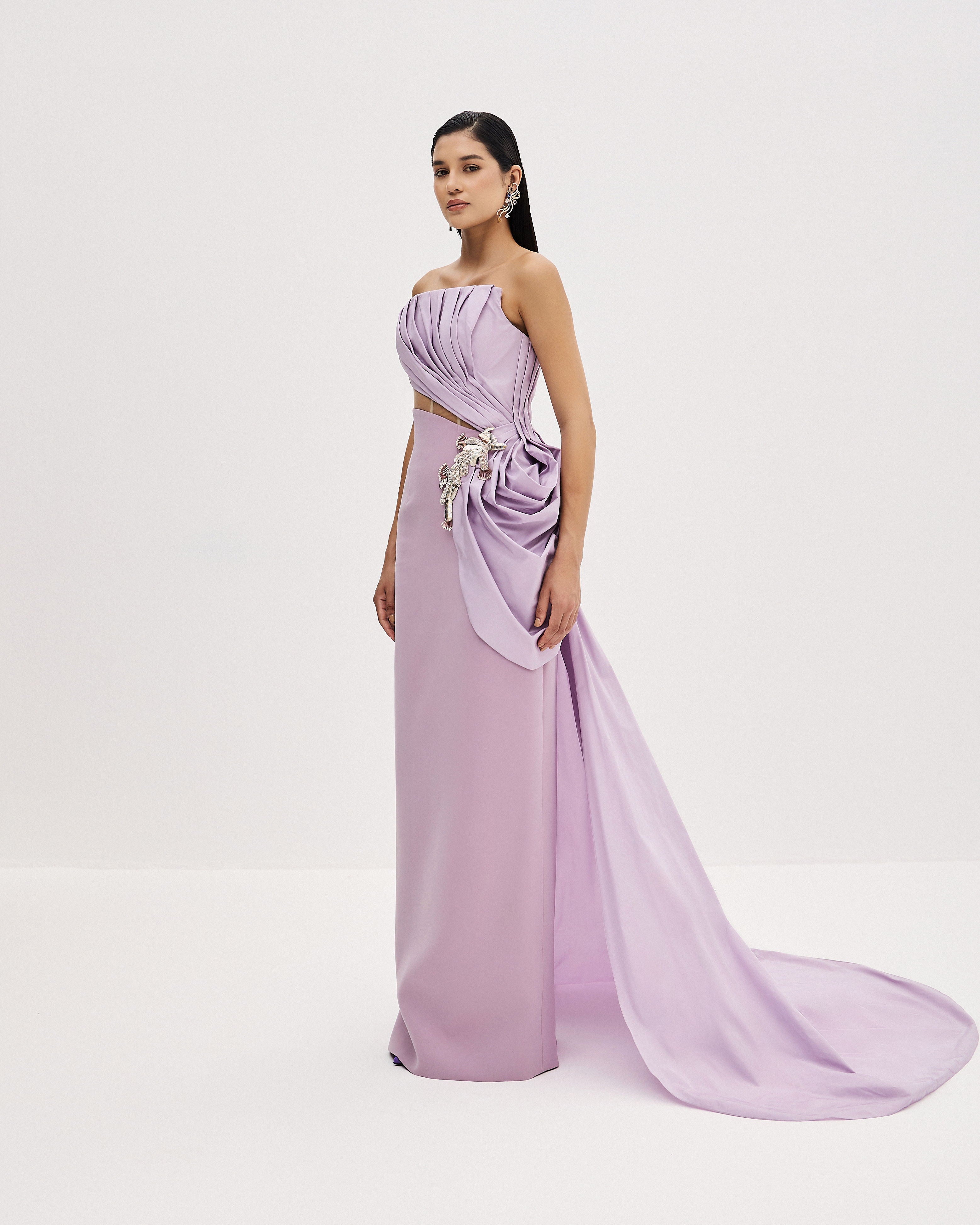 A strapless crepe and taffeta gown featuring a pleated bodice and a soft side drape, finished with a delicate rose-gold metal accessory inspired by coral. A flowing train adds a touch of drama to the silhouette.