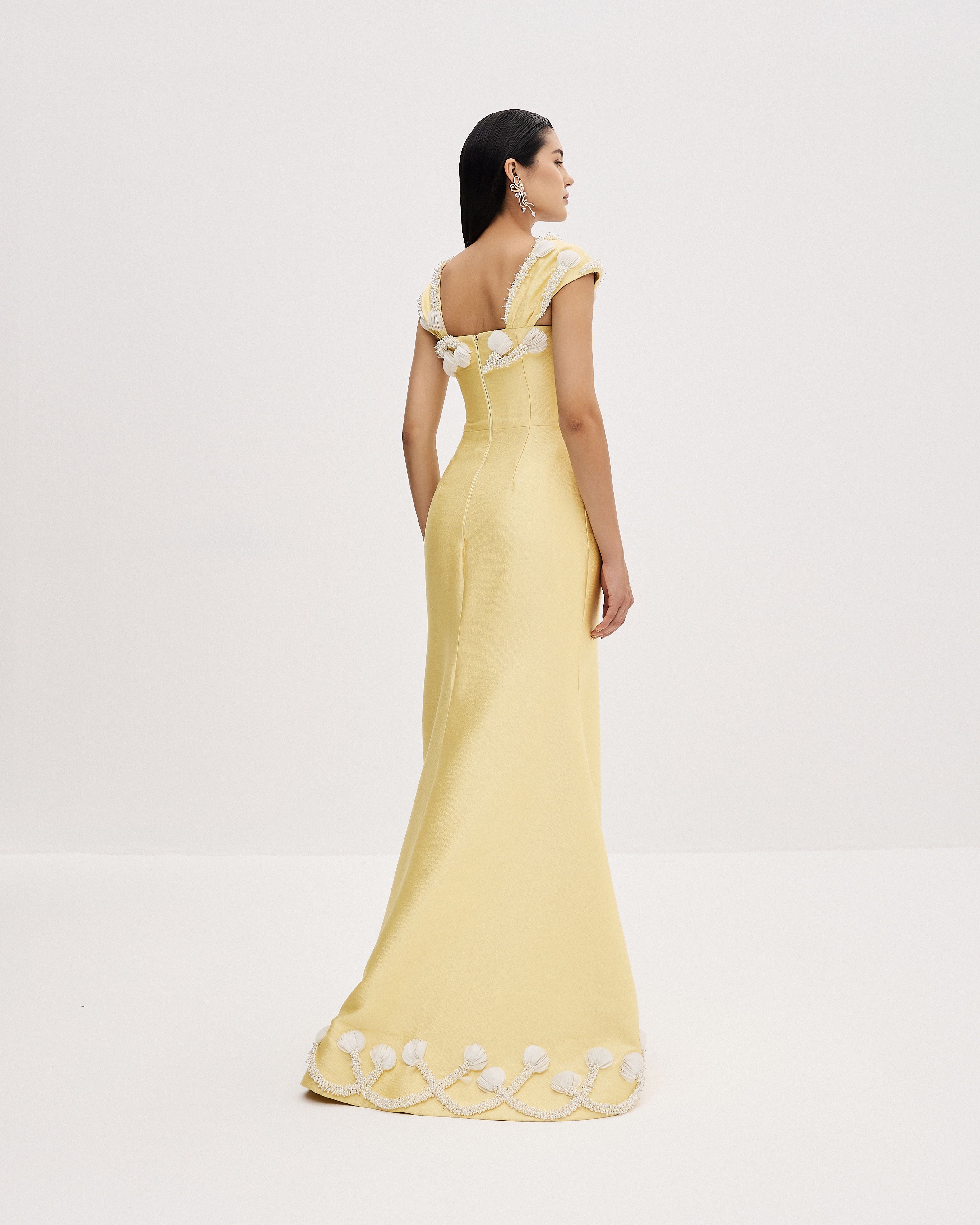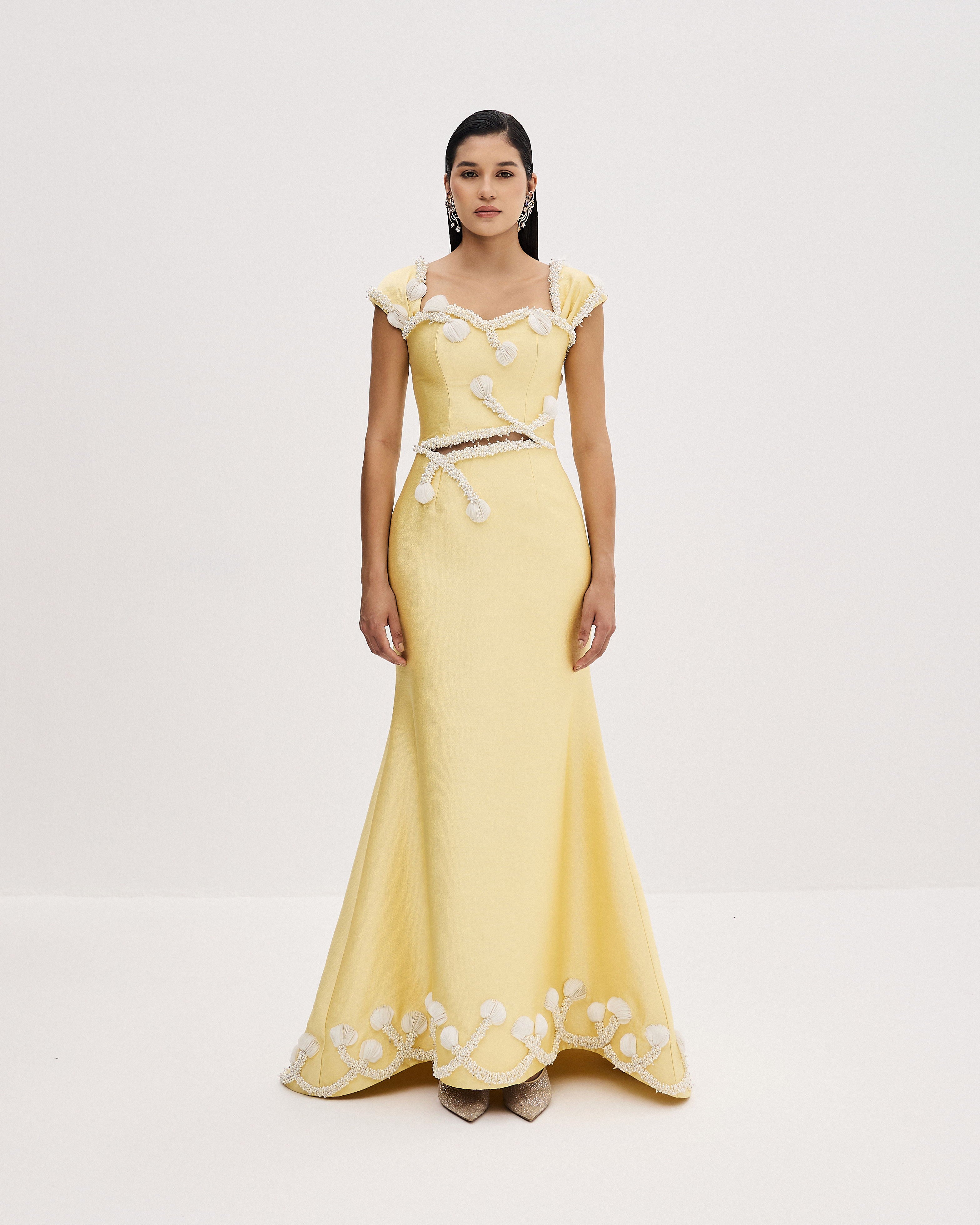 Fitted bodice gown in textured yellow mikado, featuring haute couture asymmetric 3D pearl embroidery along the edges.