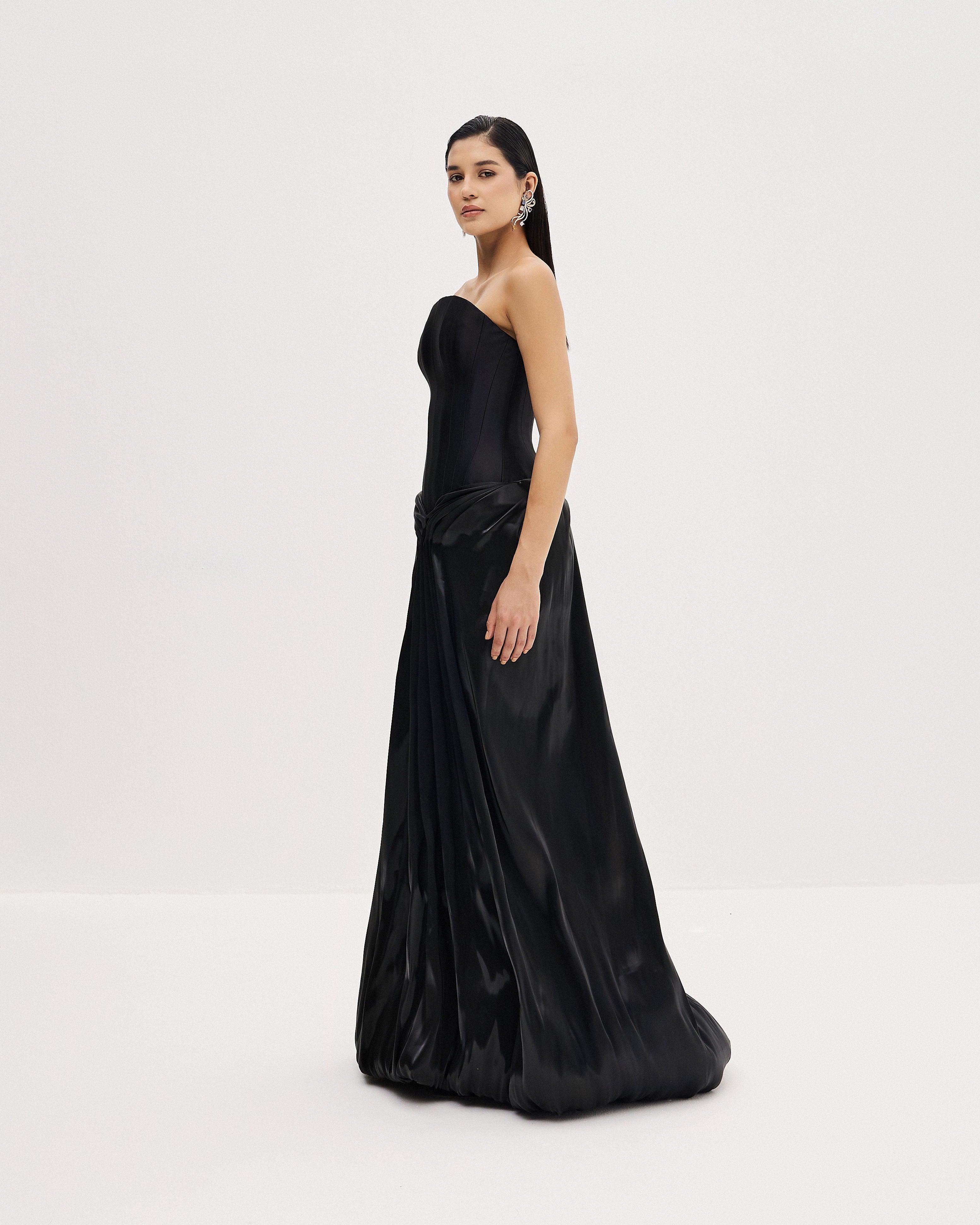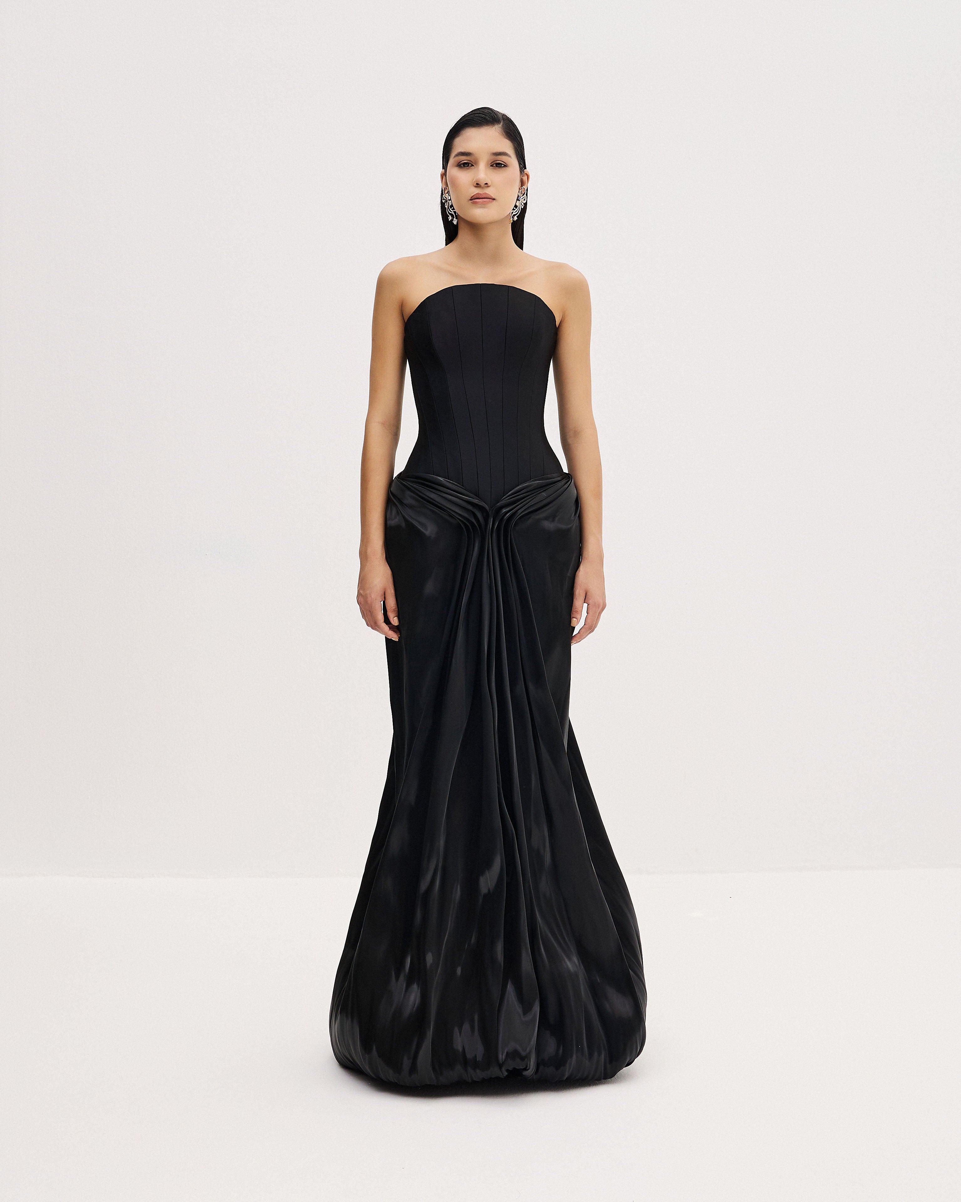 Strapless black gown featuring a structured mikado corset bodice and voluminous draping around the hips with gathered detailing, finished with a soft balloon hem.