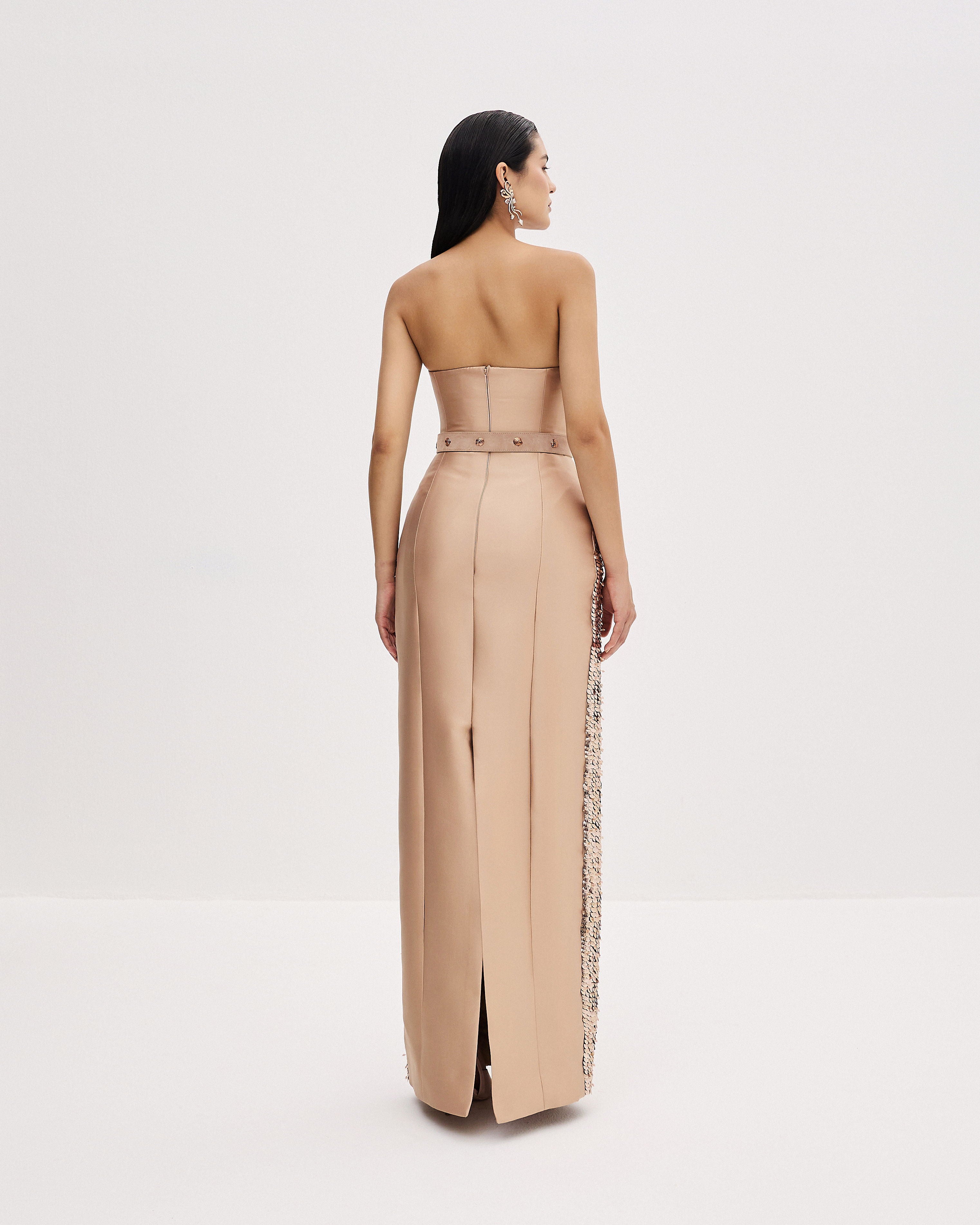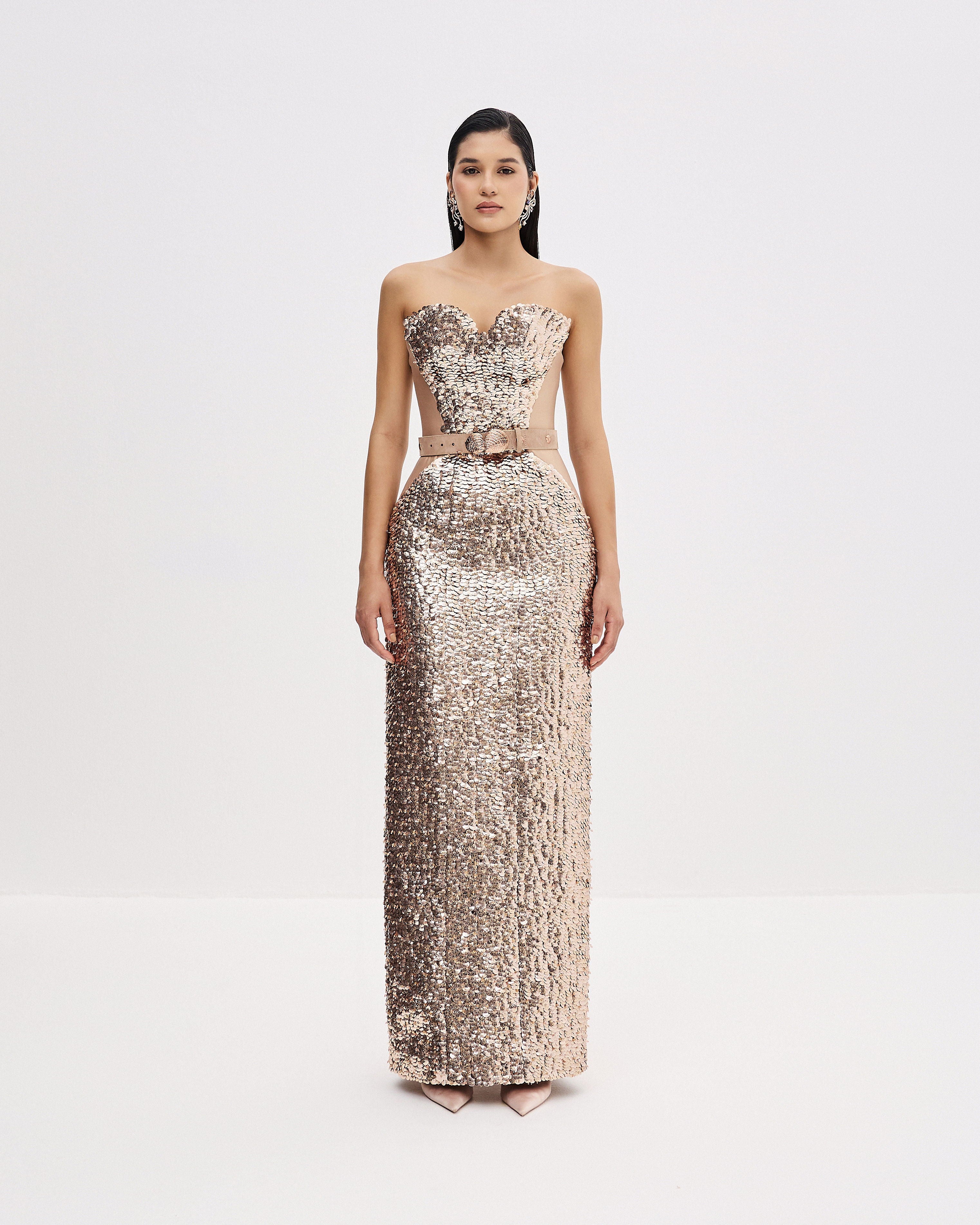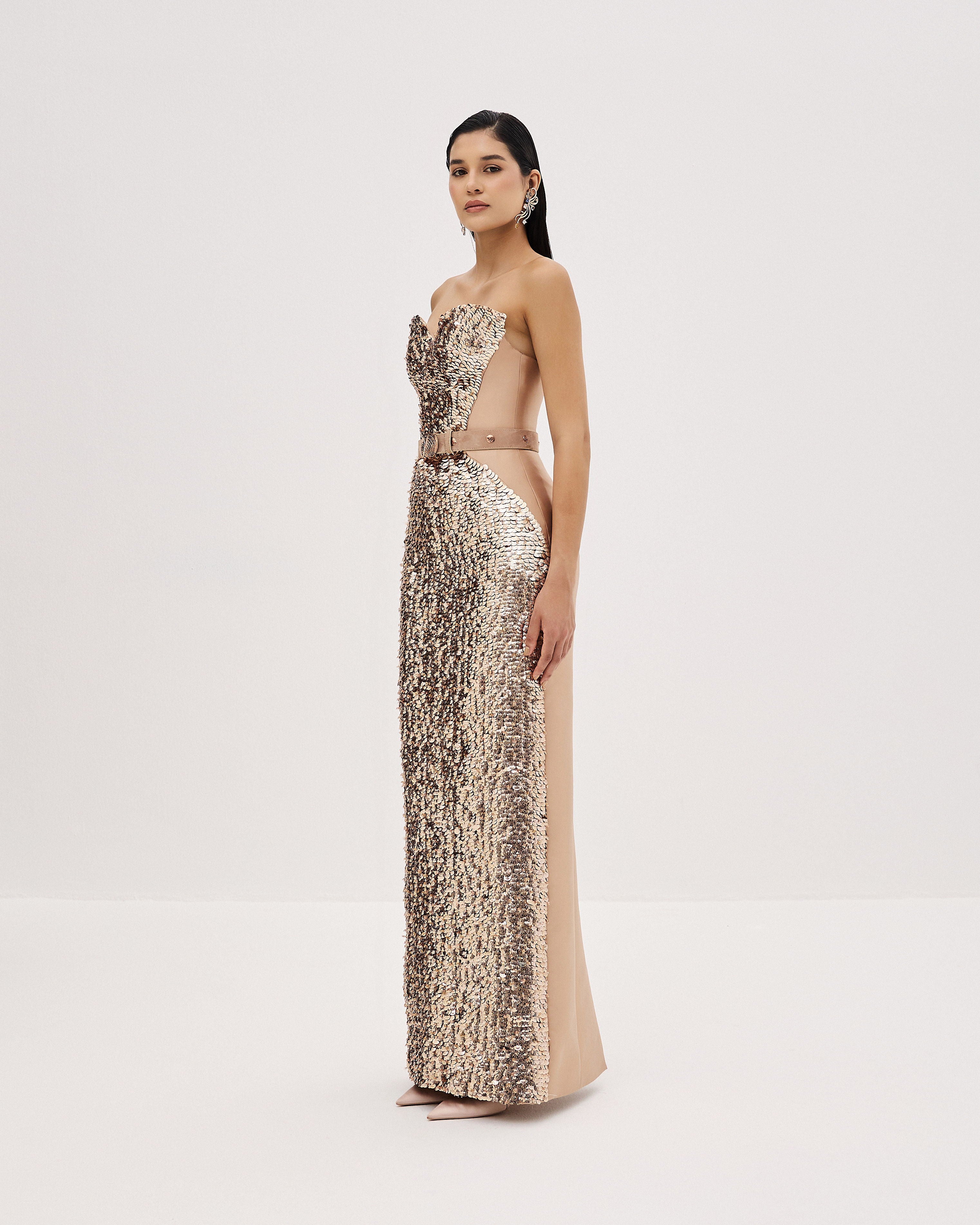 Strapless haute couture gown with full front hand embellishments inspired by seashells, featuring a fitted silhouette and a defined waist, accented by a custom-made leather shell belt.