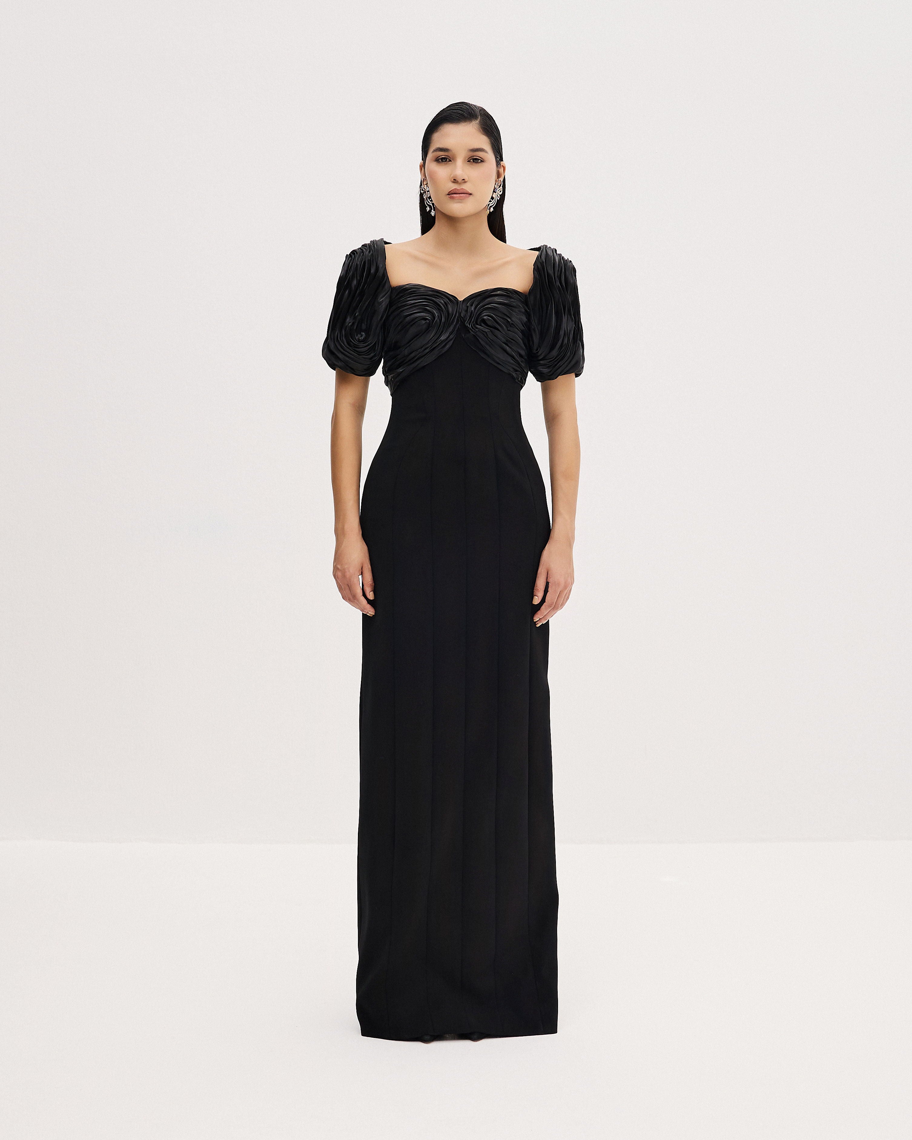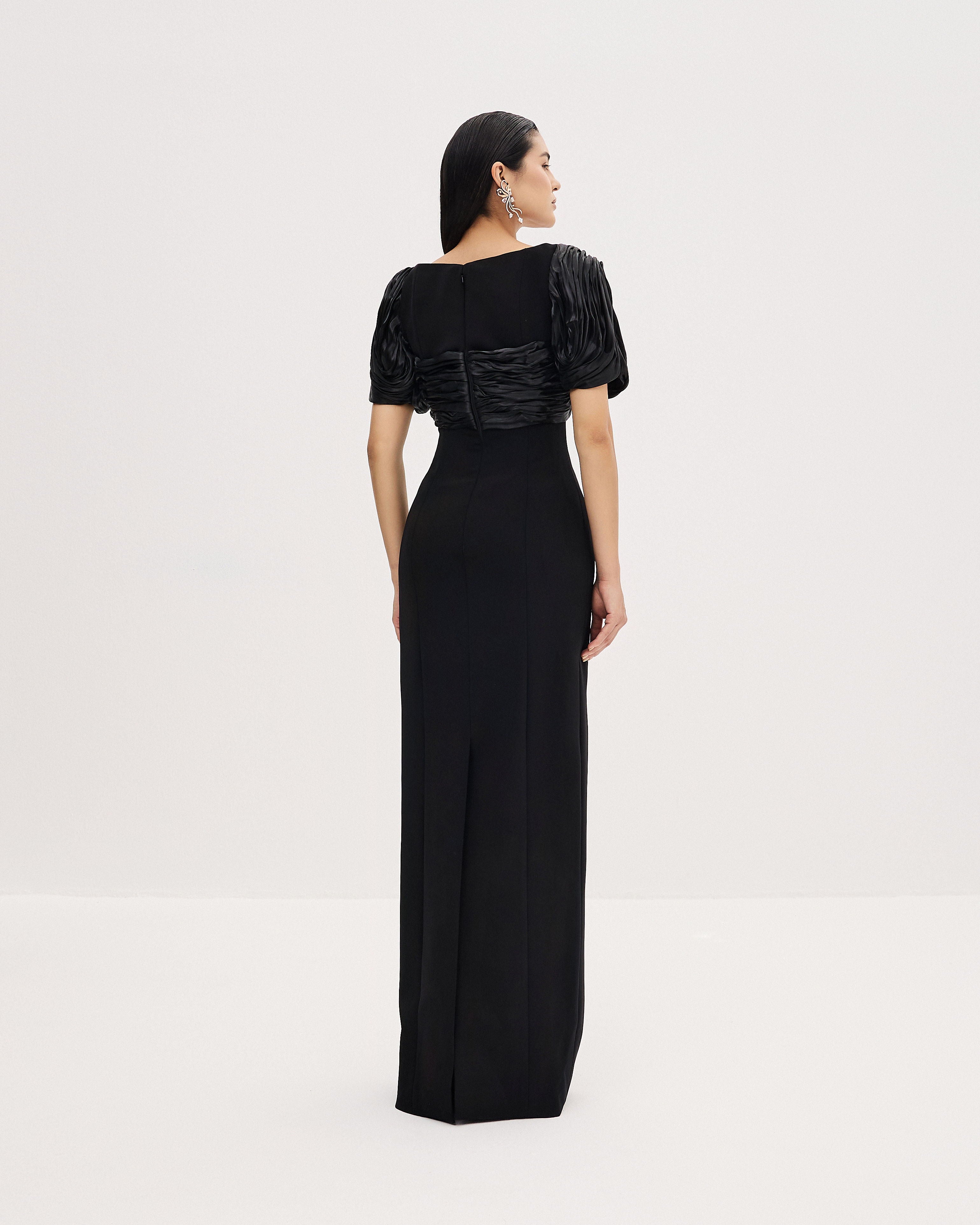 Black floor-length crepe gown featuring sculpted short sleeves and a structured bodice with intricate fabric-manipulated swirl detailing. The sleek silhouette offers a refined and timeless elegance.