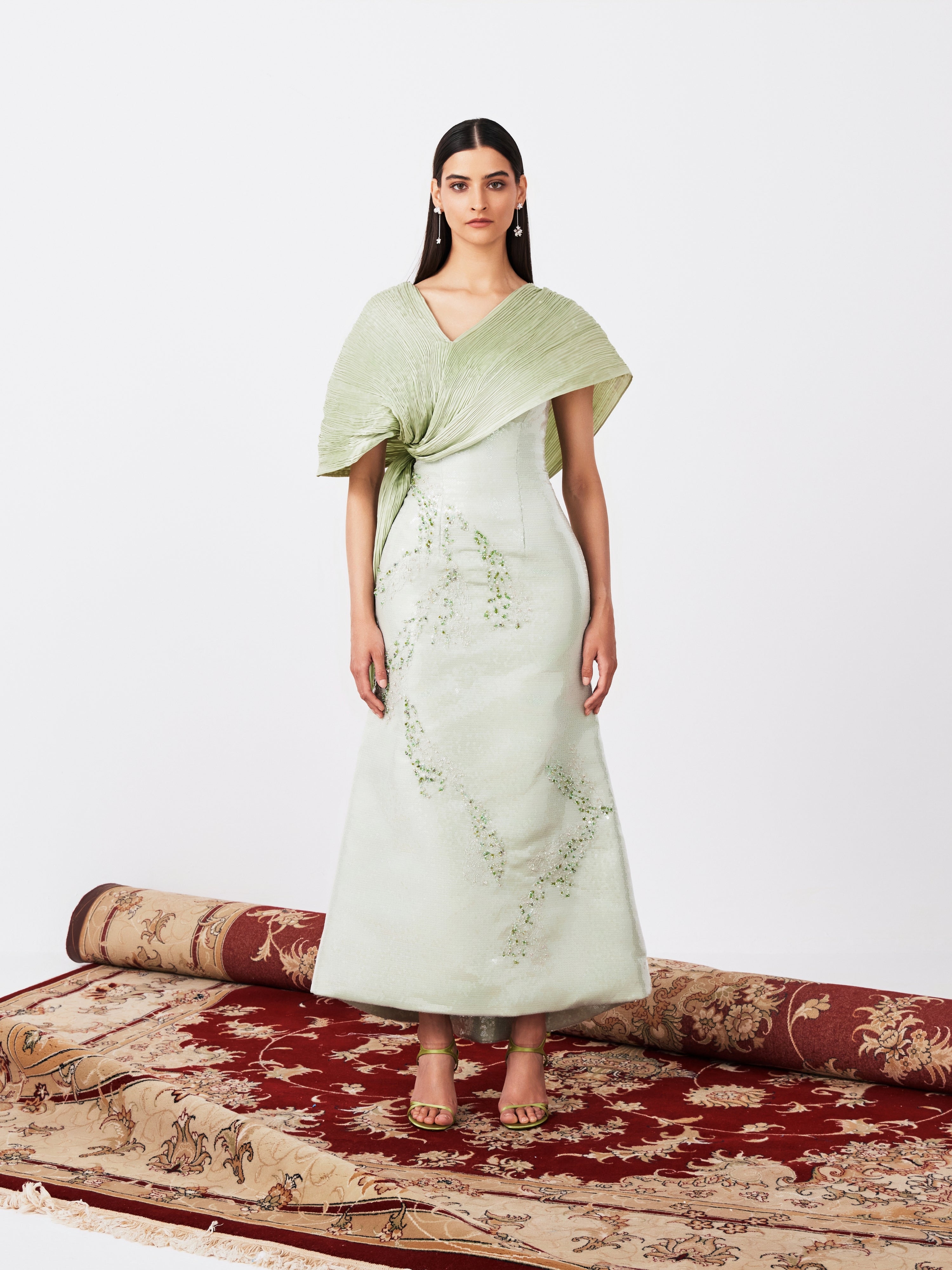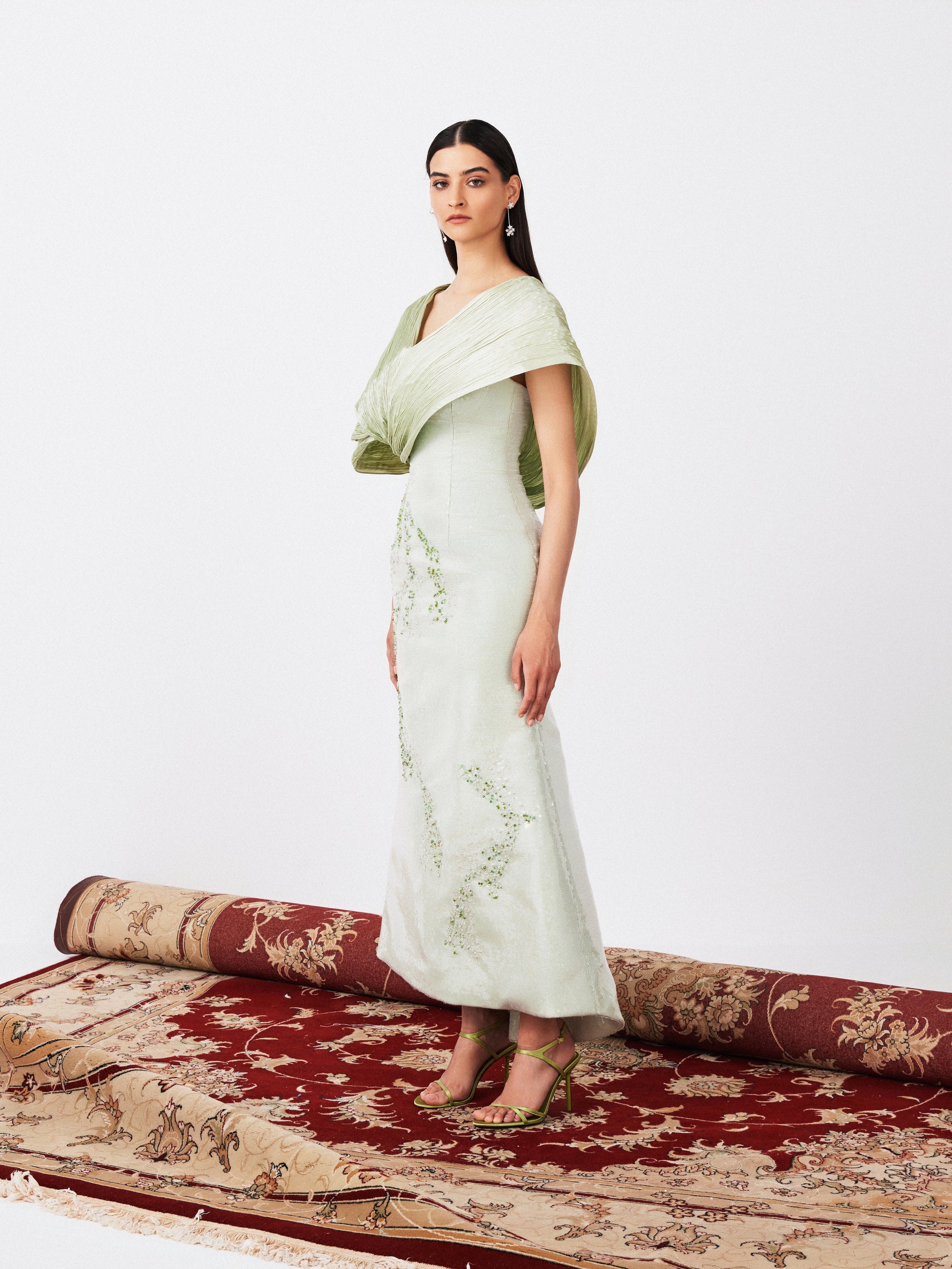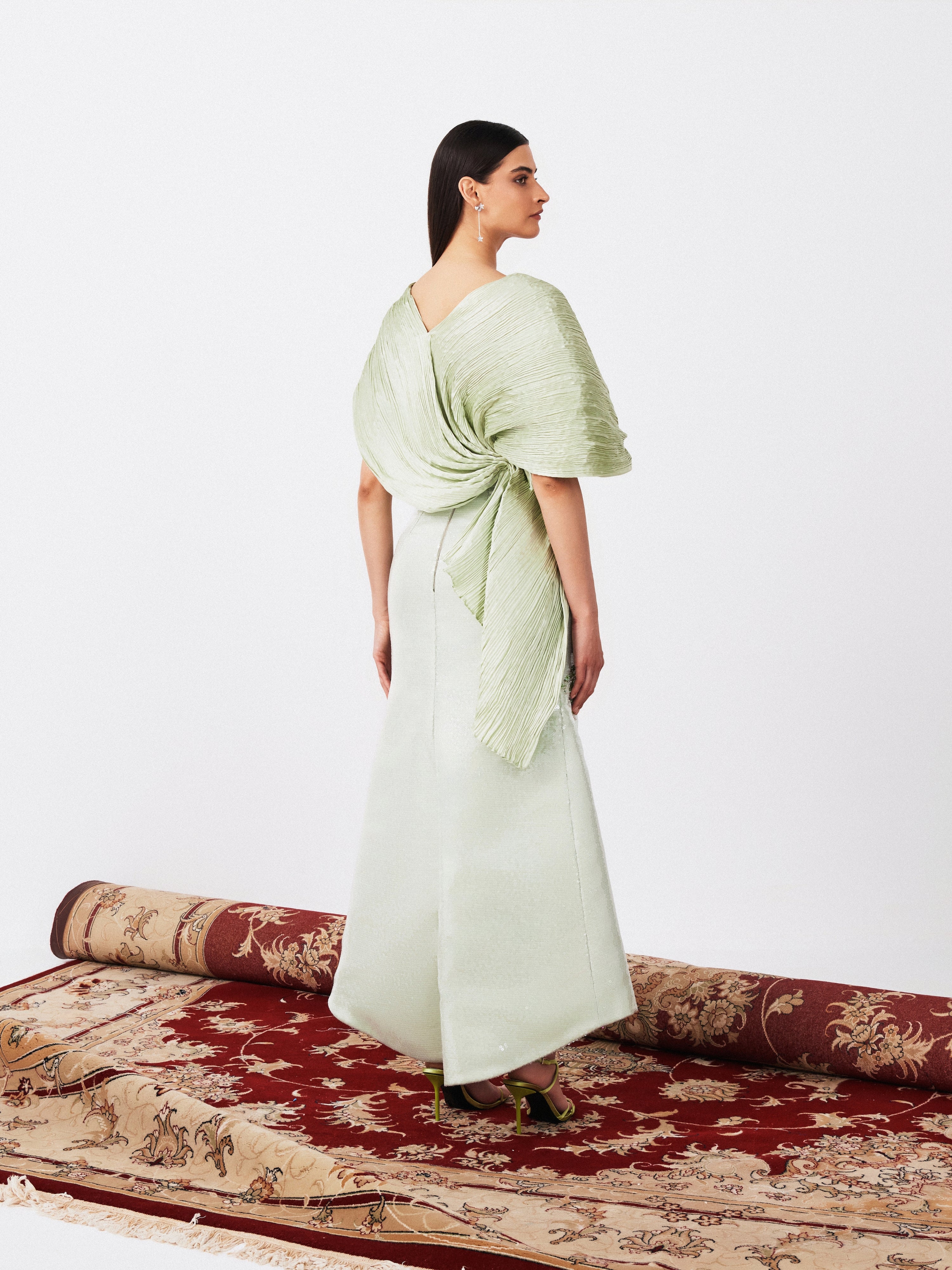 Ankle Length Sequence Gown With Hand Embellishment And Mikado Fabric Manipulation Draped Top