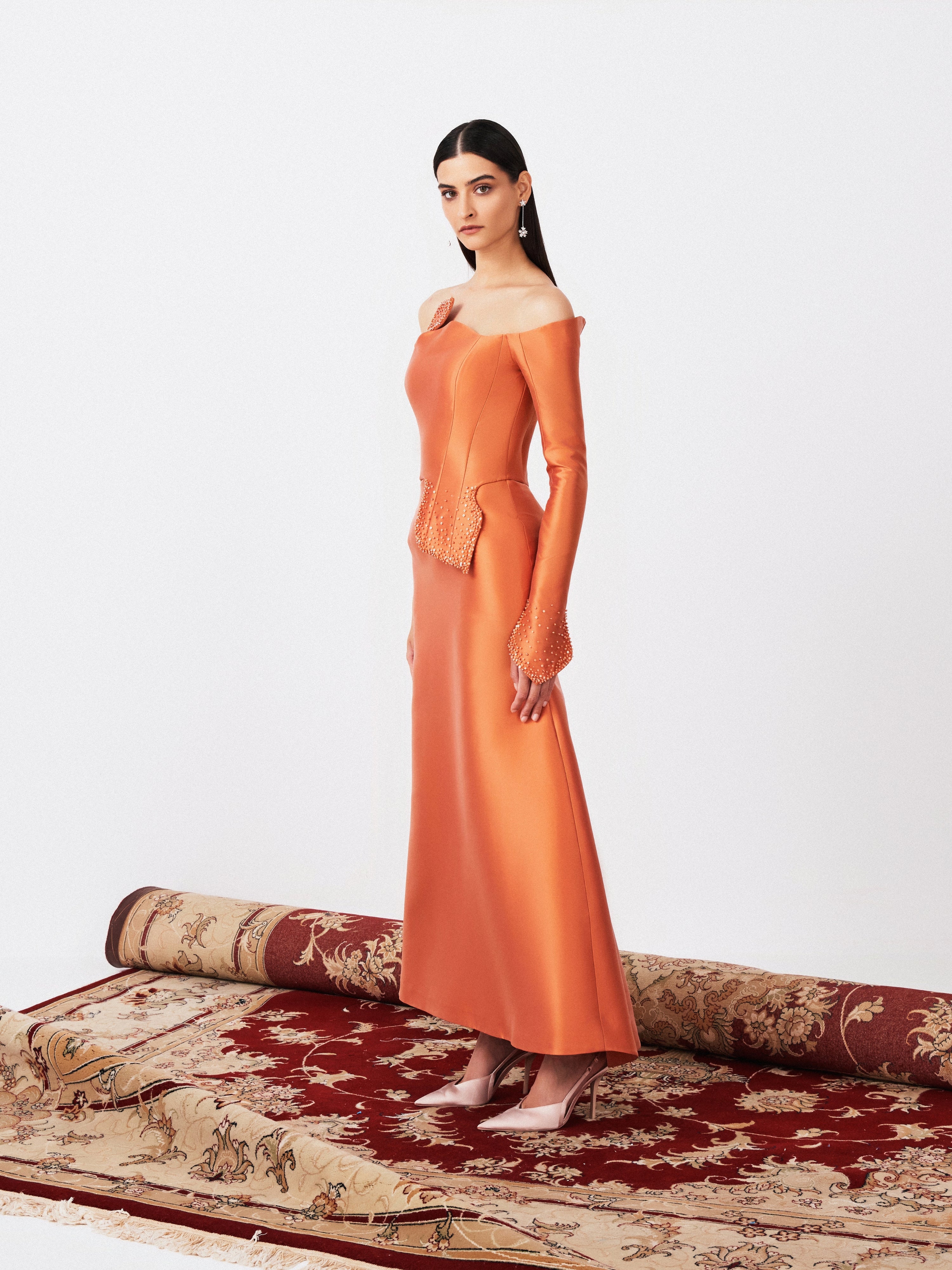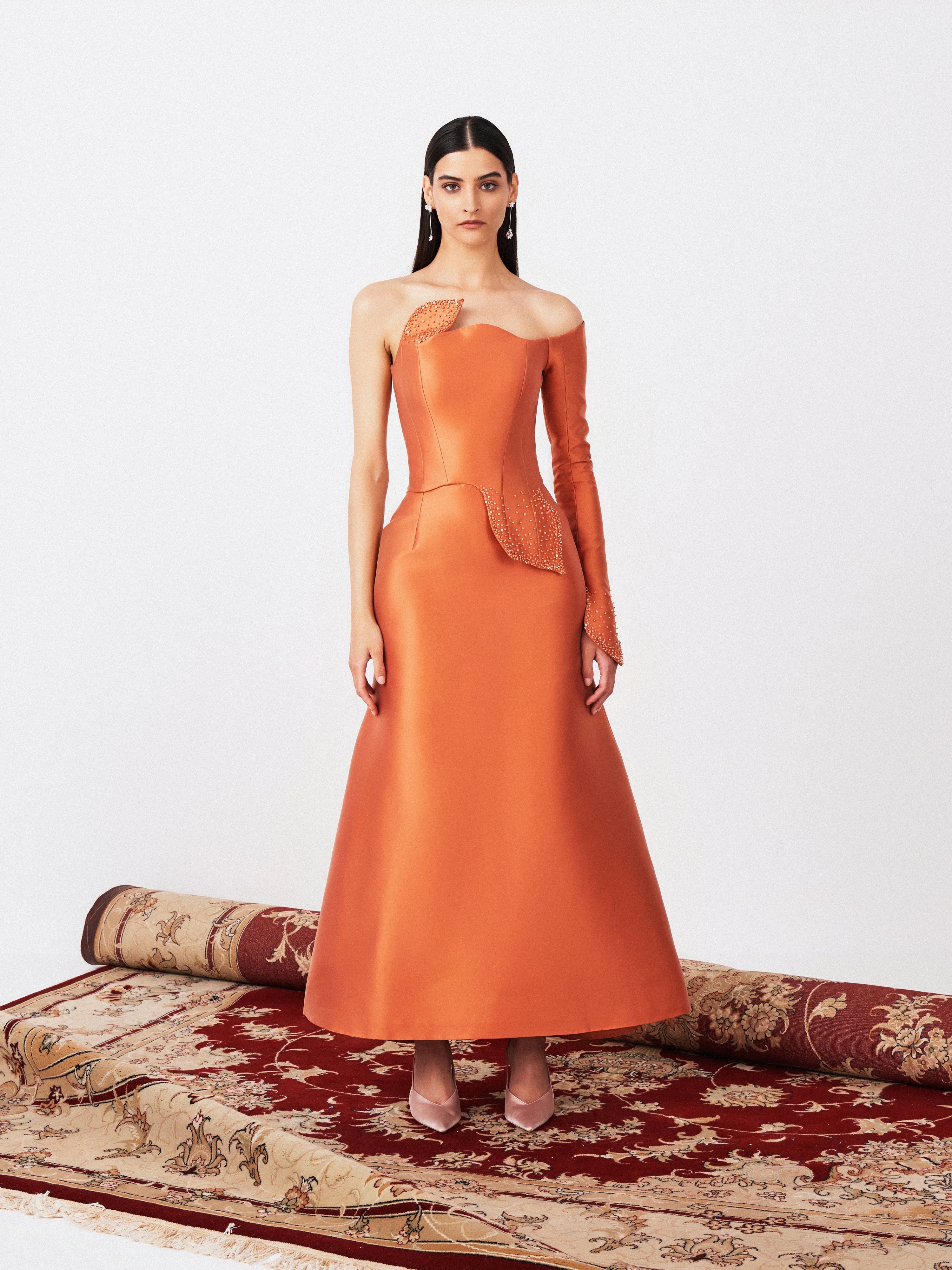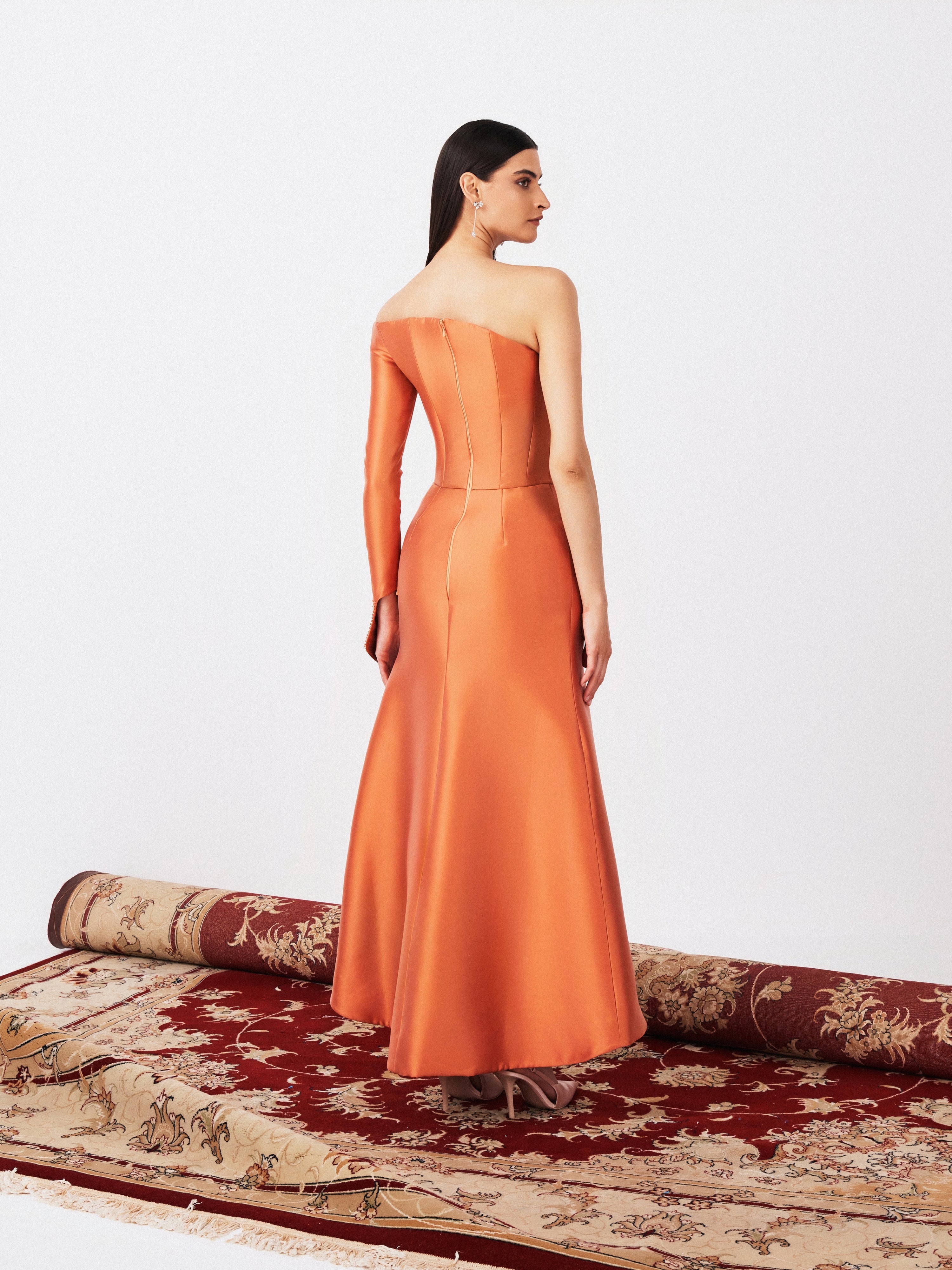 Asymmetrical Ankle Gown With Dessert Rose Leaves Cut And Scattered Embroidery
