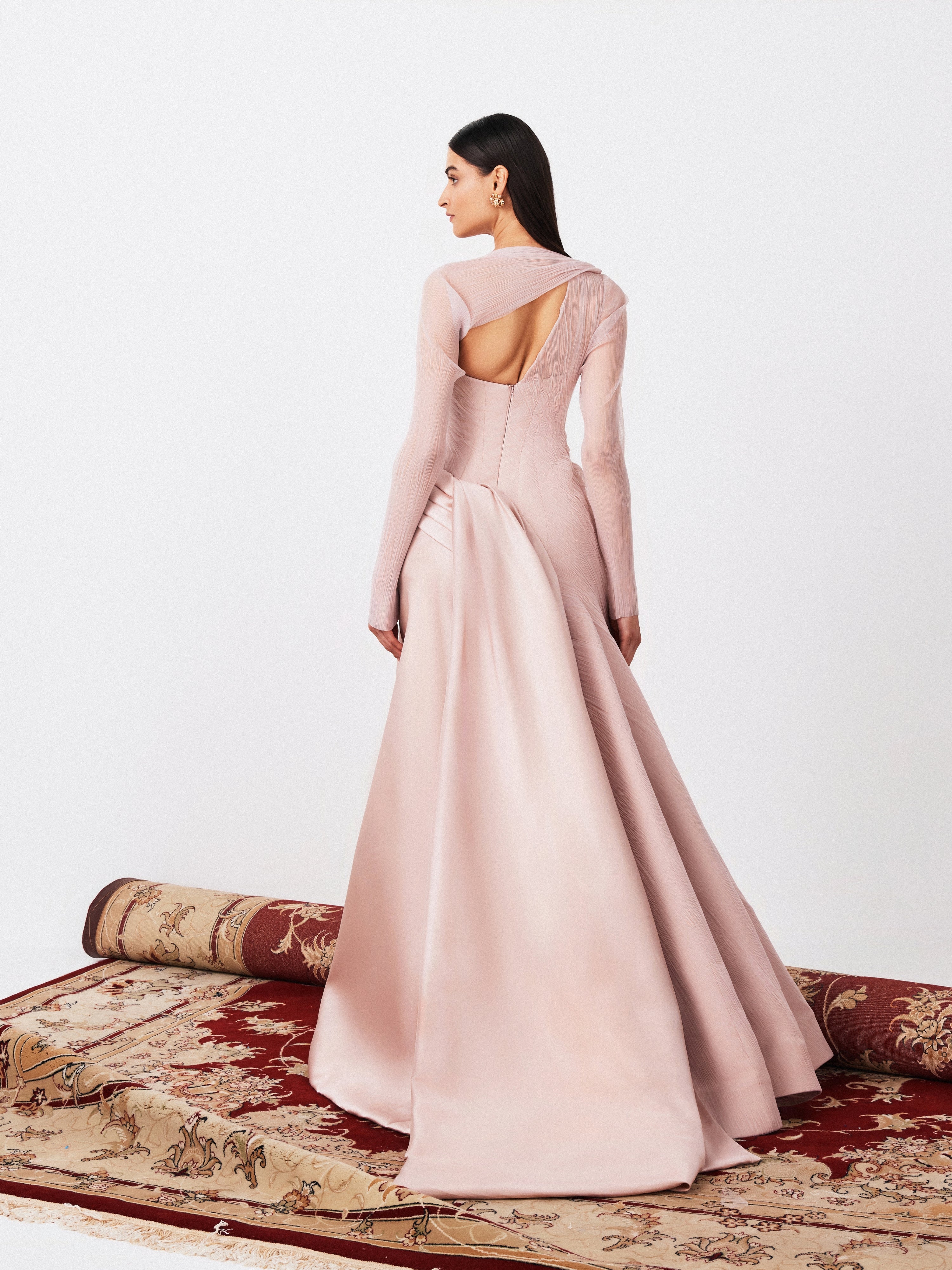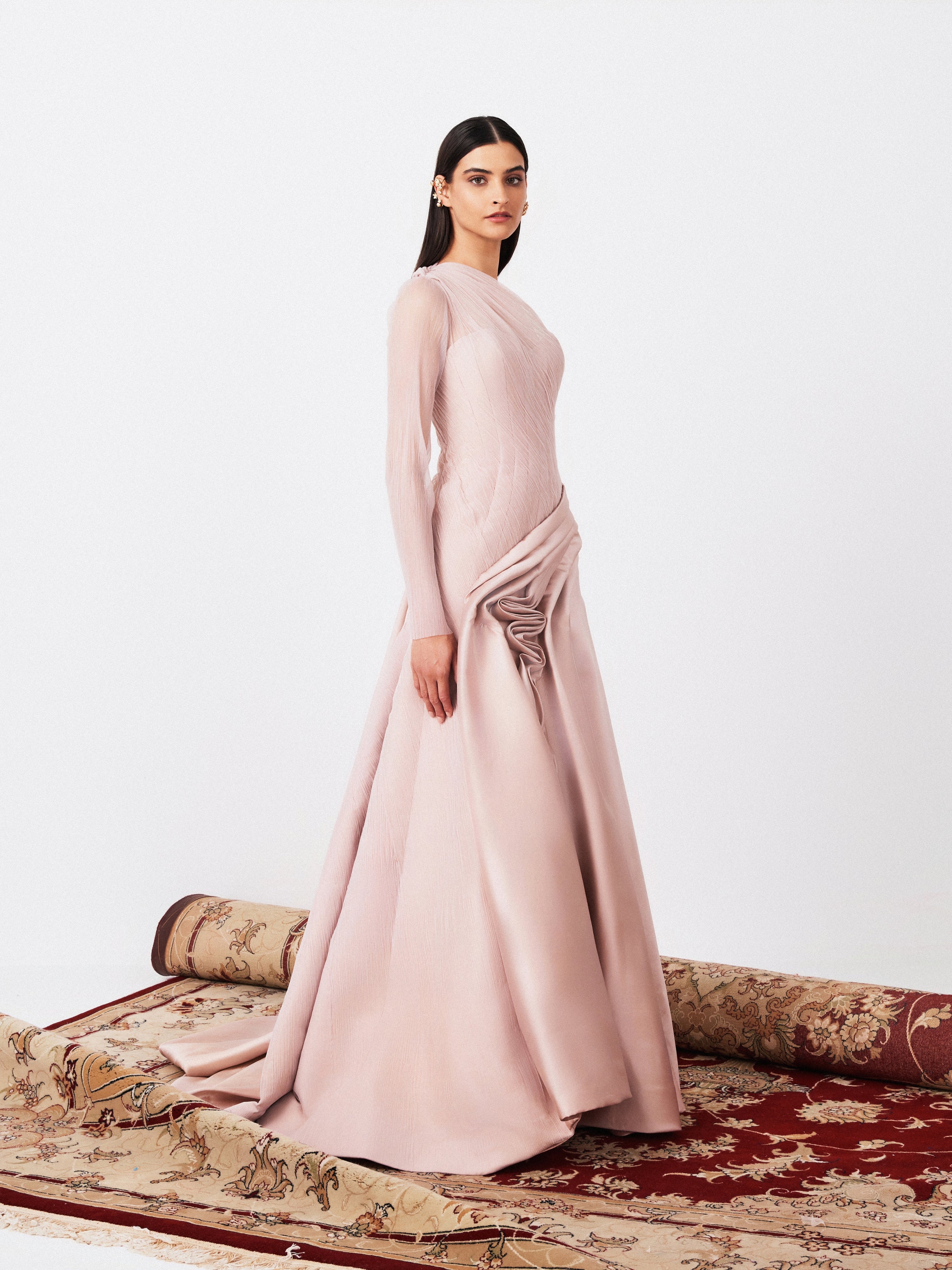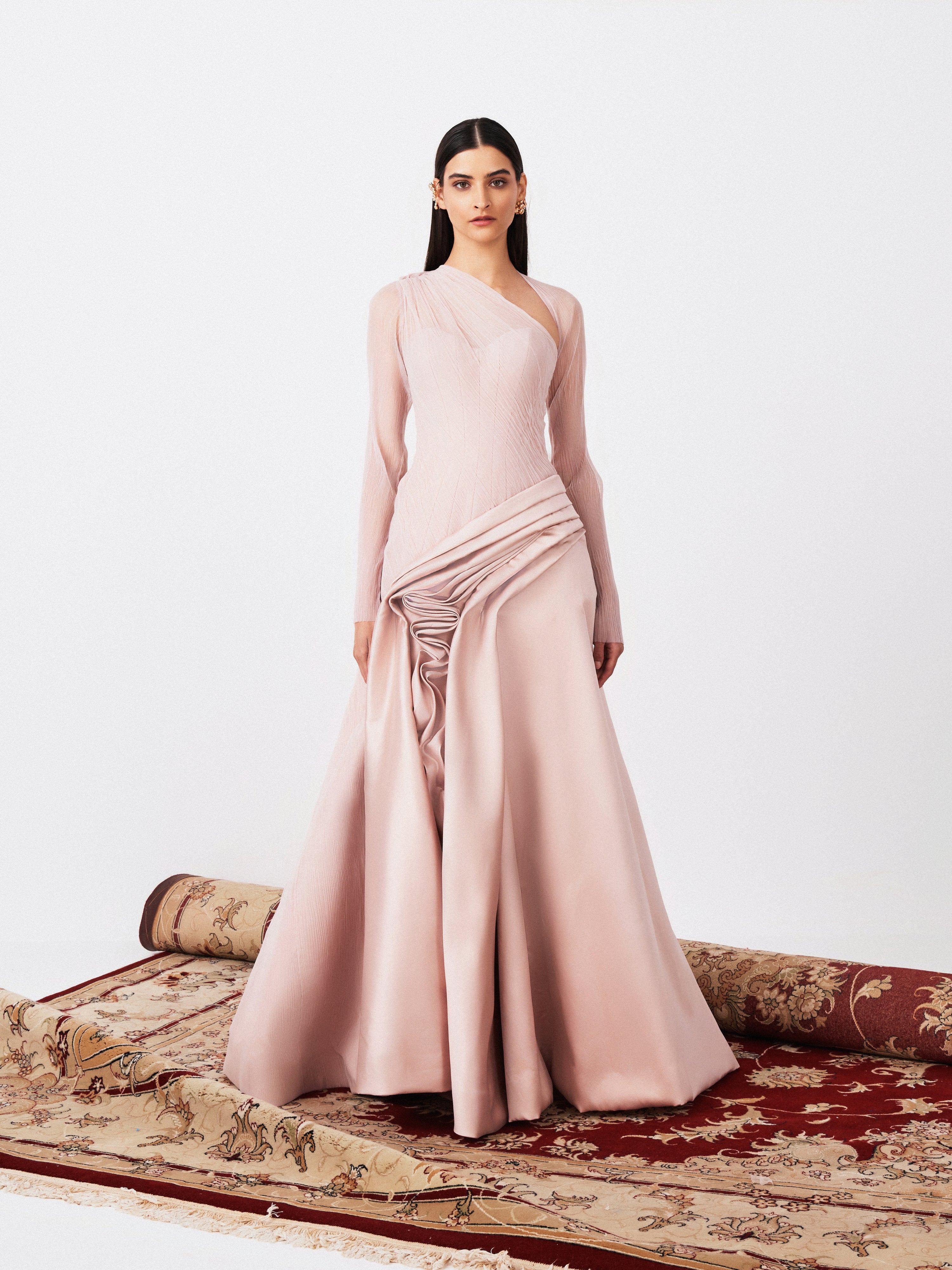 Asymmetrical Gown In Tulle Fabric Manipulation And Draping Detail