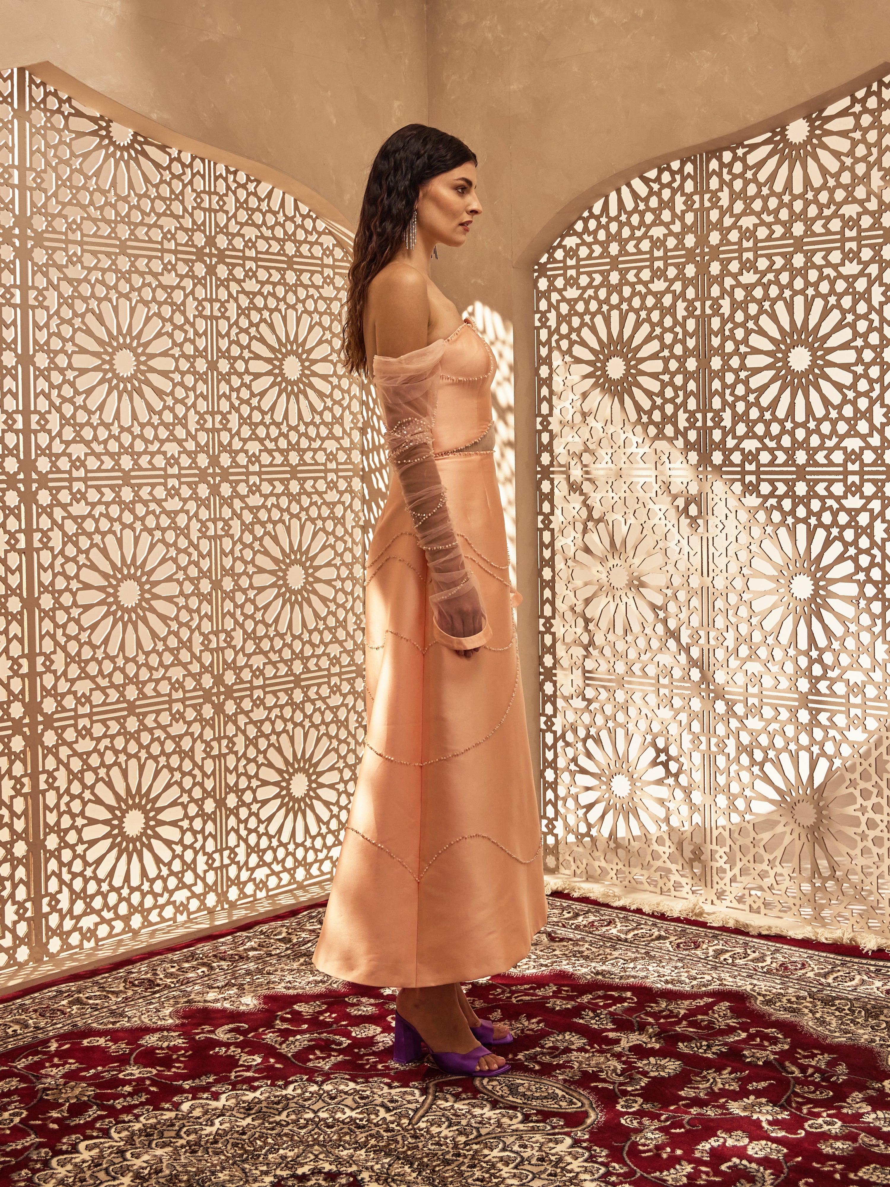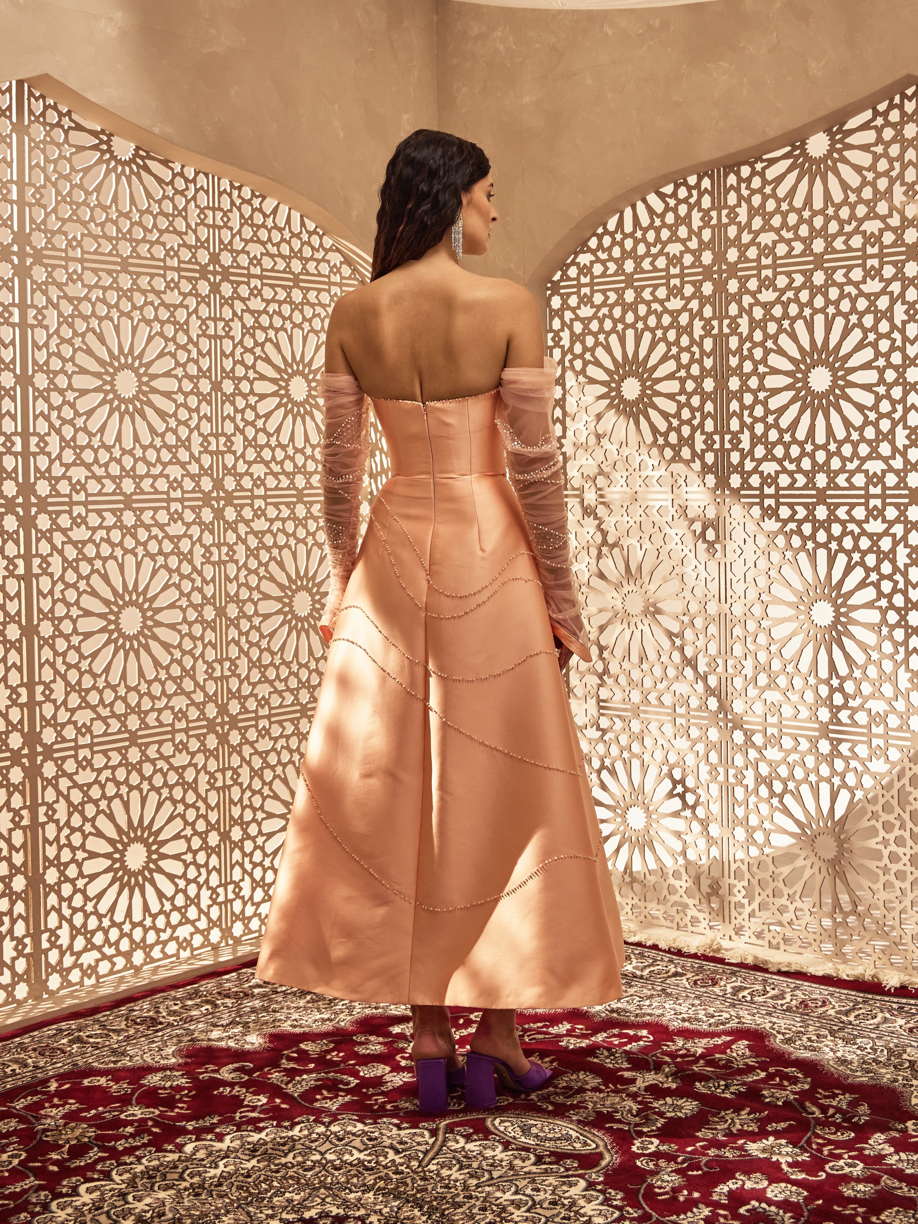 Off-Shoulder Gown With Draped Tulle Embroidered Sleeves