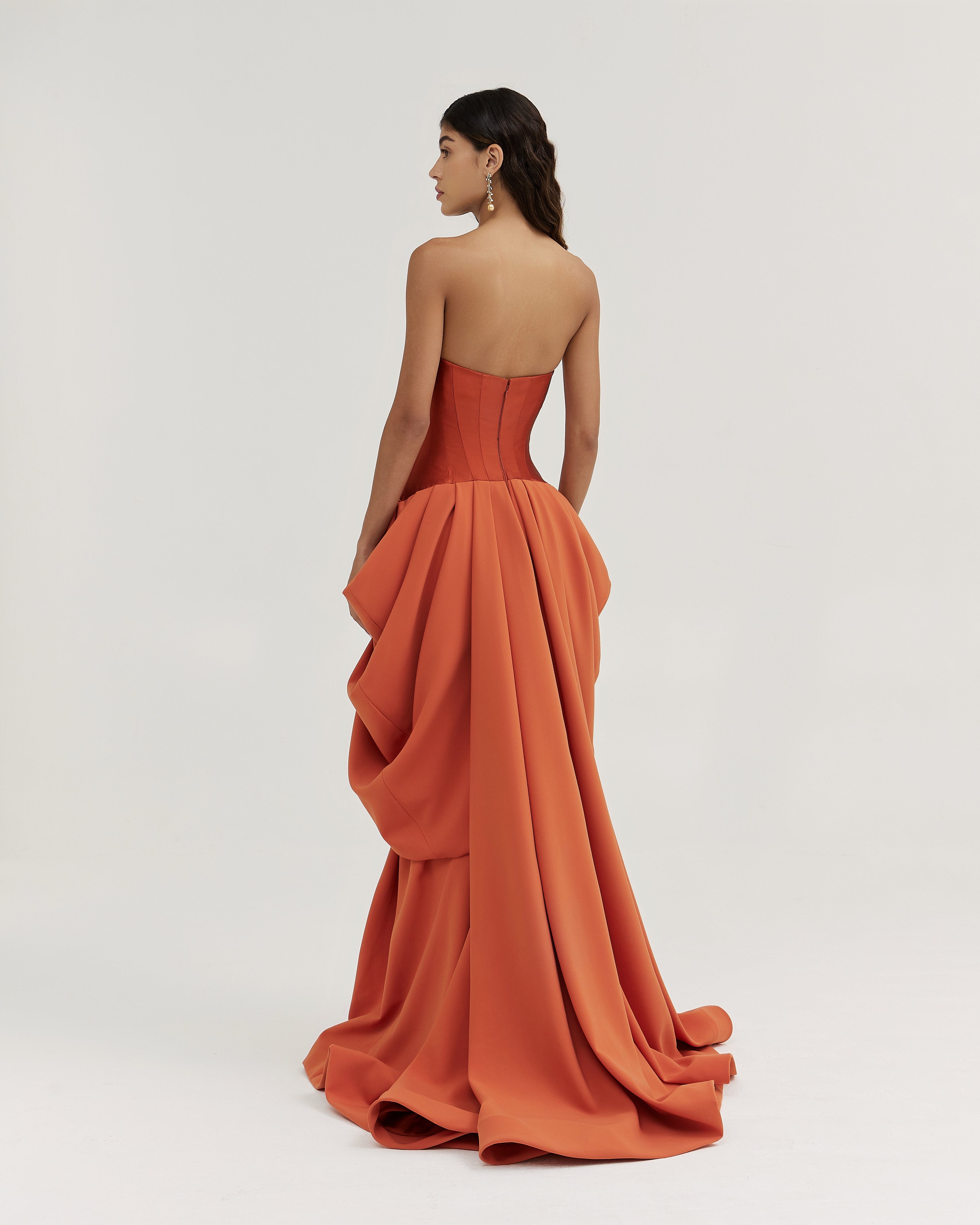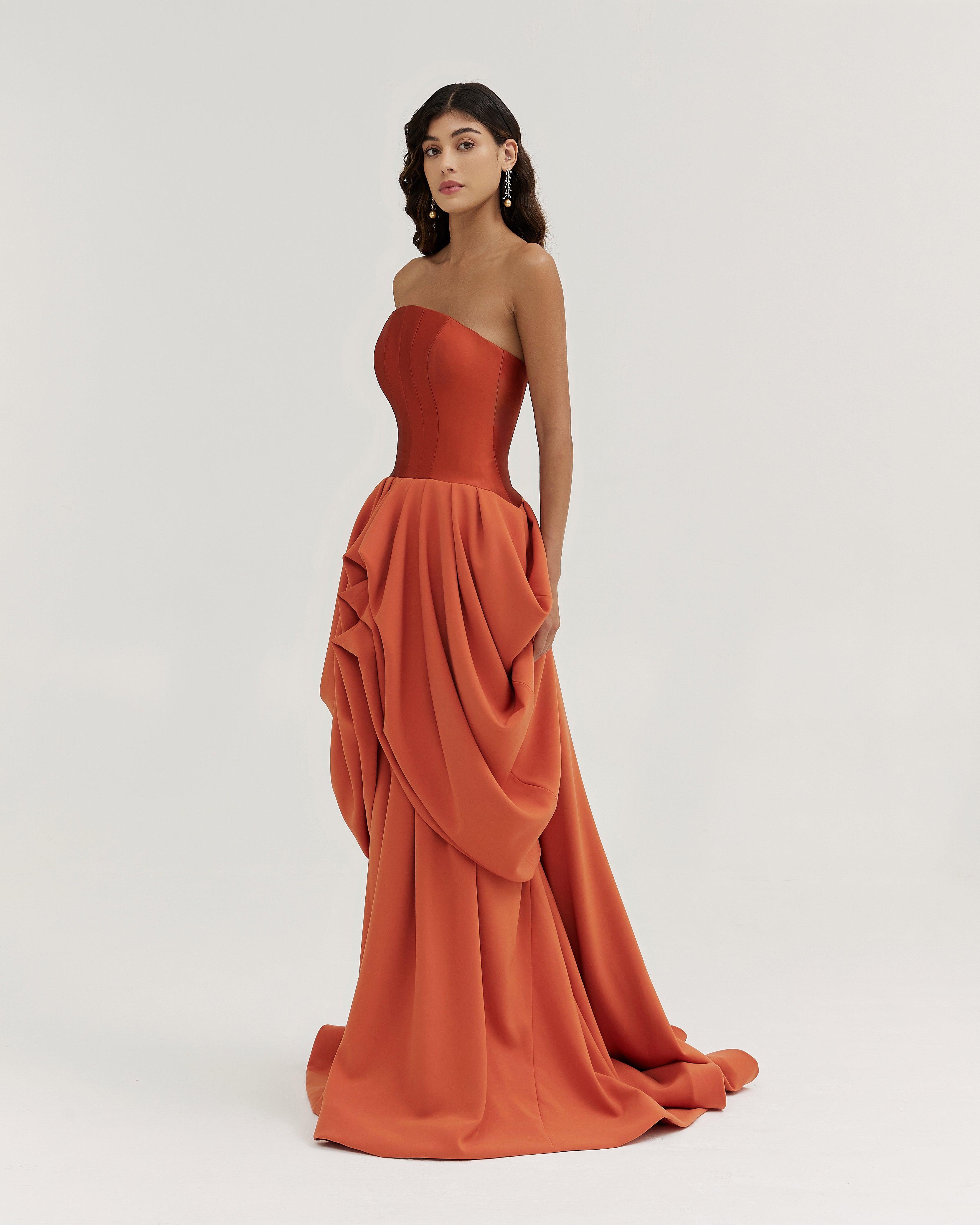 A symmetrical sleeveless gown in Mikado and crepe, enhanced with dramatic layered draping details.
