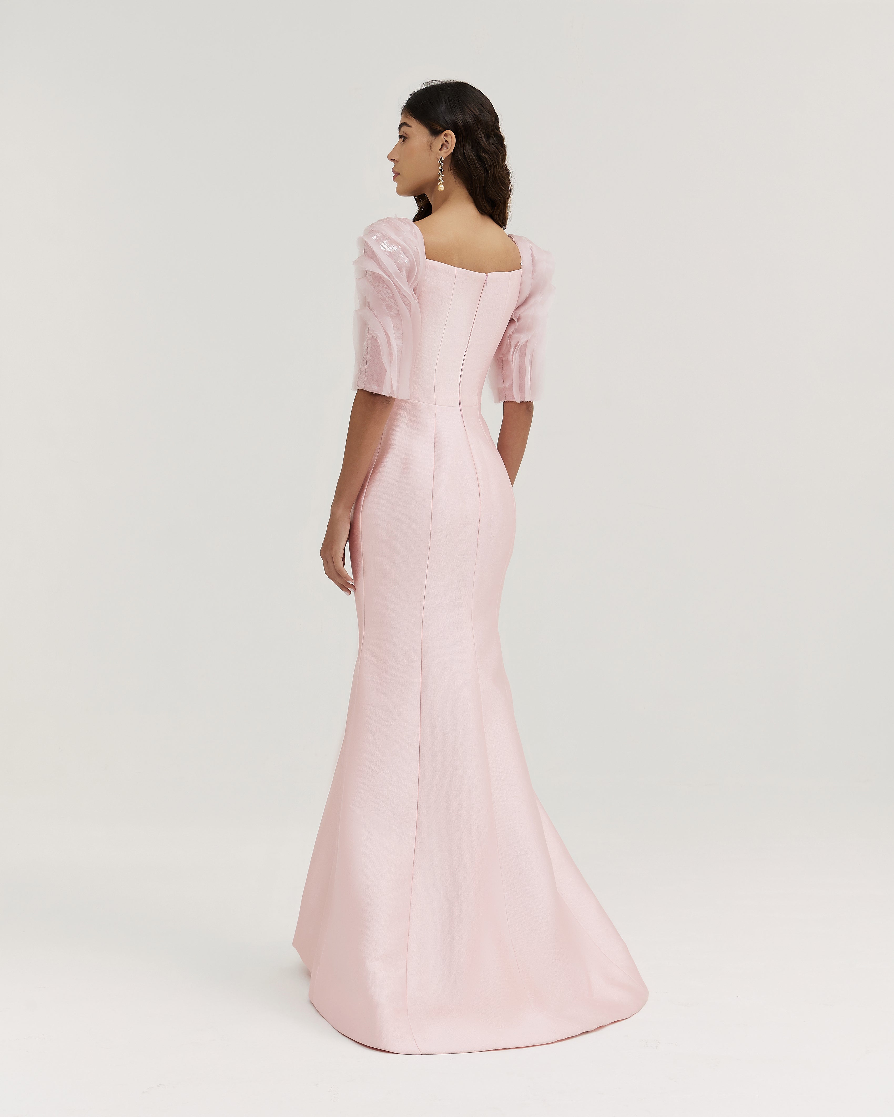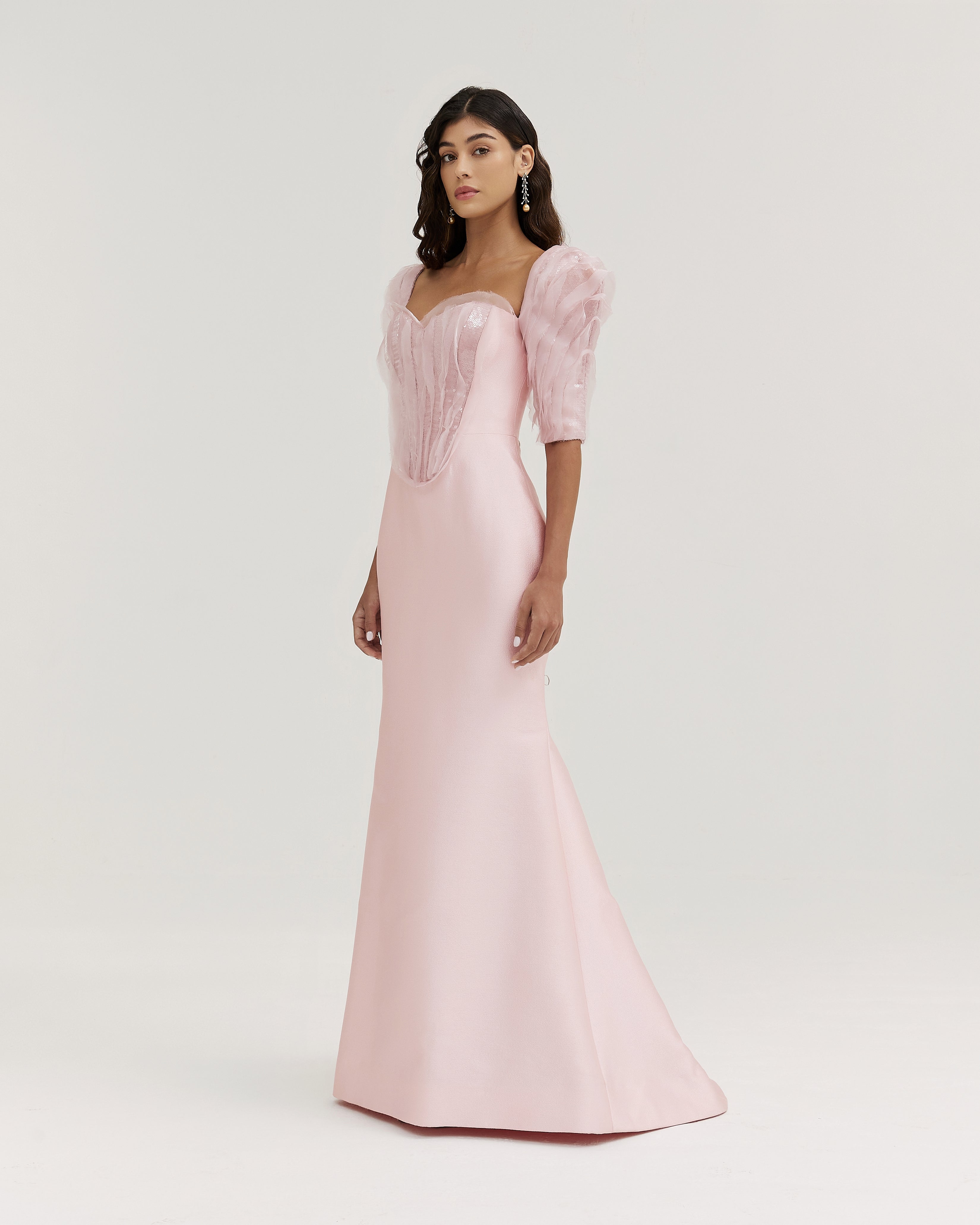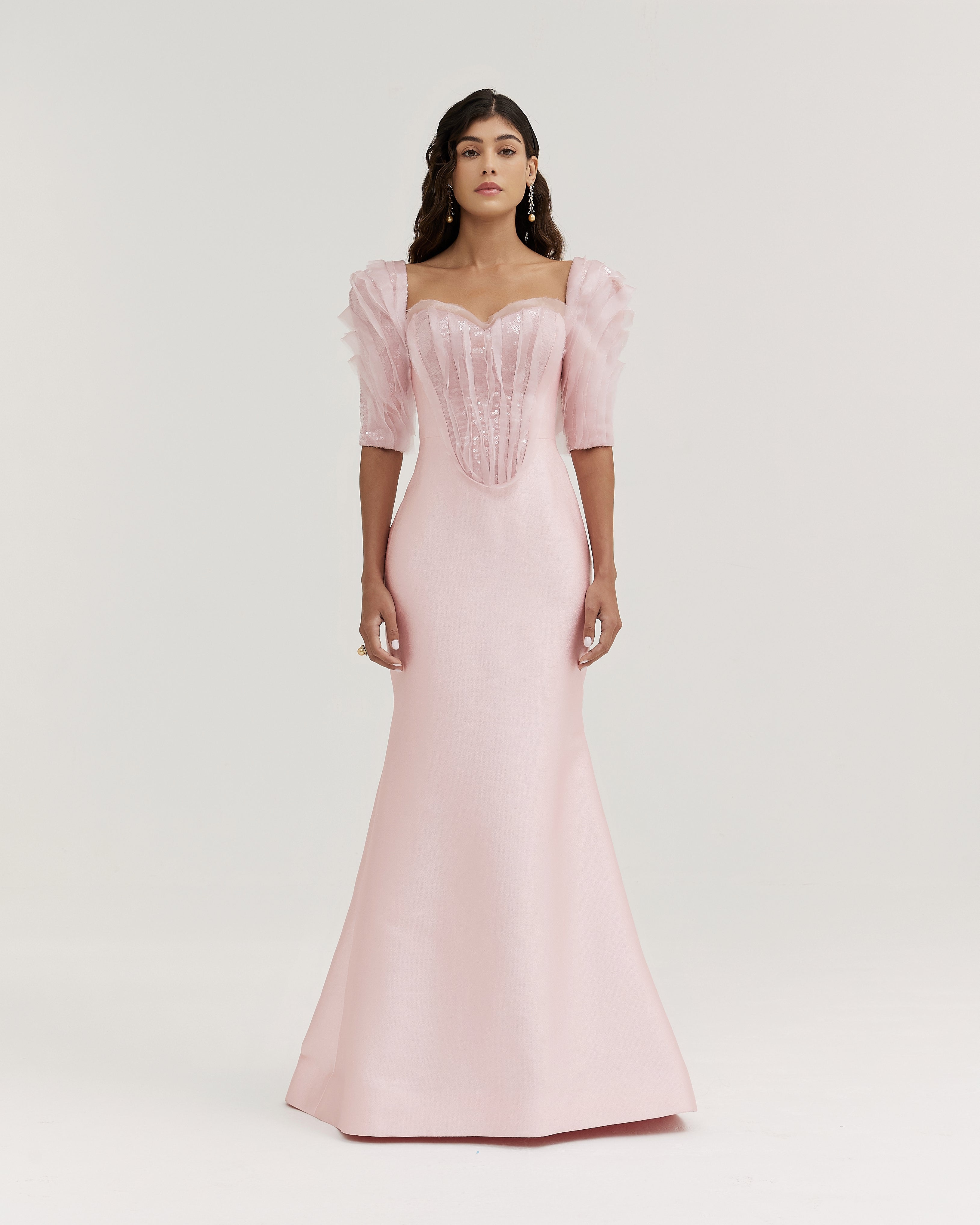Symmetrical textured sequin gown with statement organza ribbons on the sleeves and bodice.